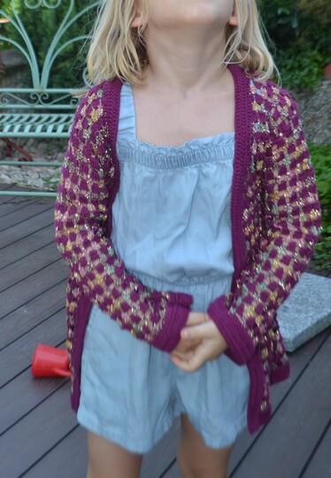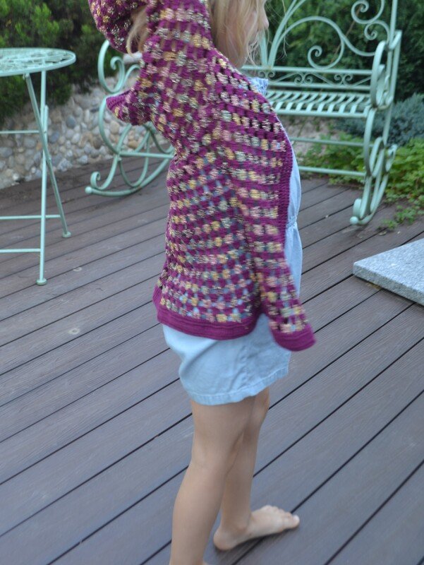Die abgebildete Jacke ist aus 4-fädigem Bobbel und einem Lurexgarn Nomotta “Capriccio”gefertigt. Dieses Garn ist leider nicht mehr erhältlich, kann aber mit anderem Garn ersetzt werden. (s. unten) Das Garn “Brillino” ist in sehr vielen Farben erhältlich.