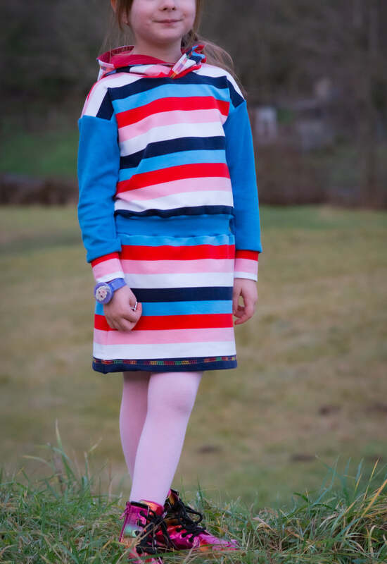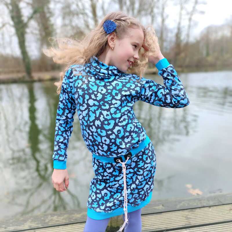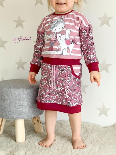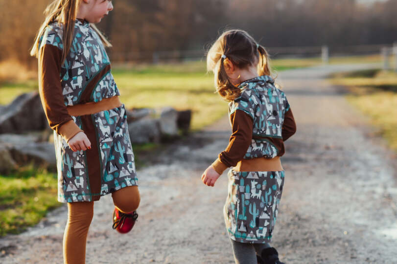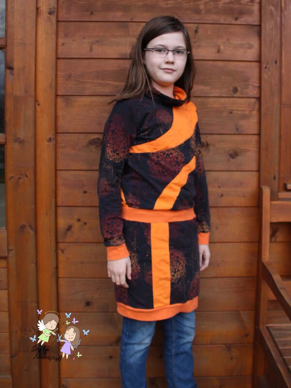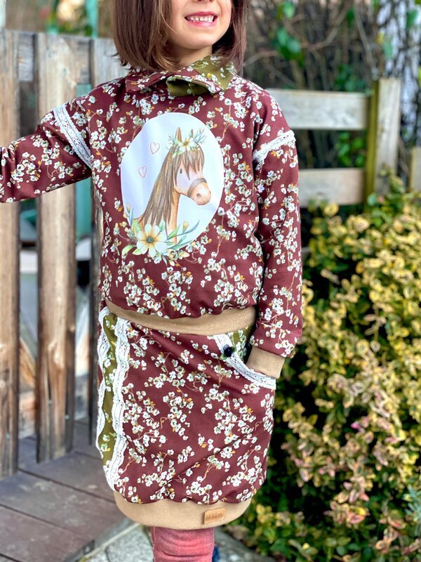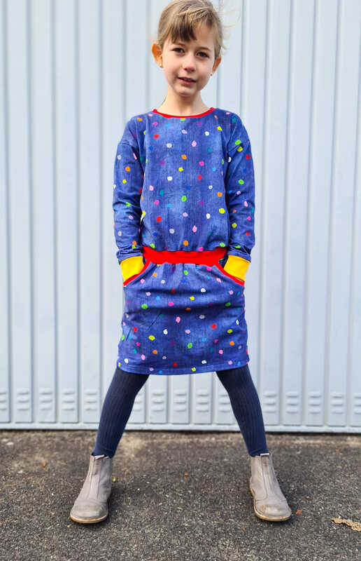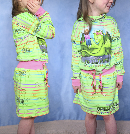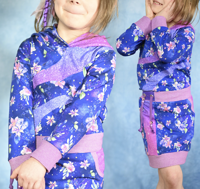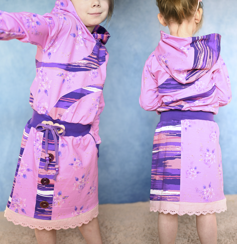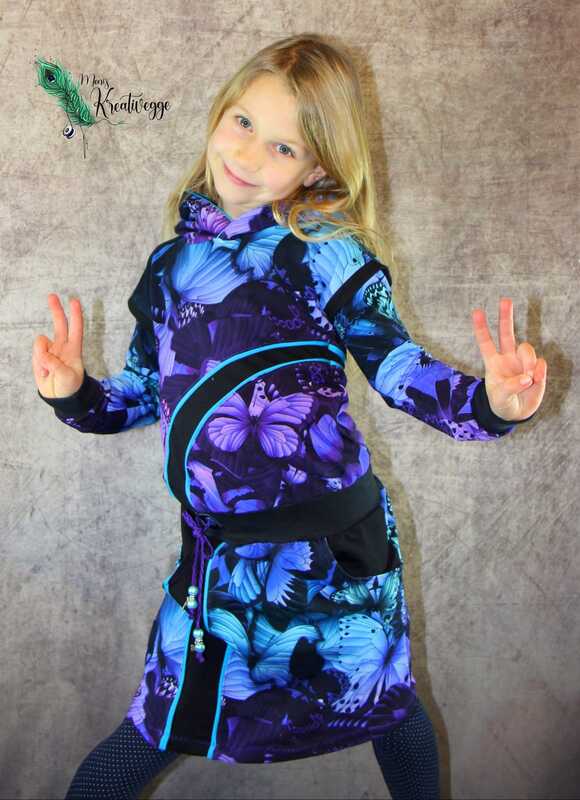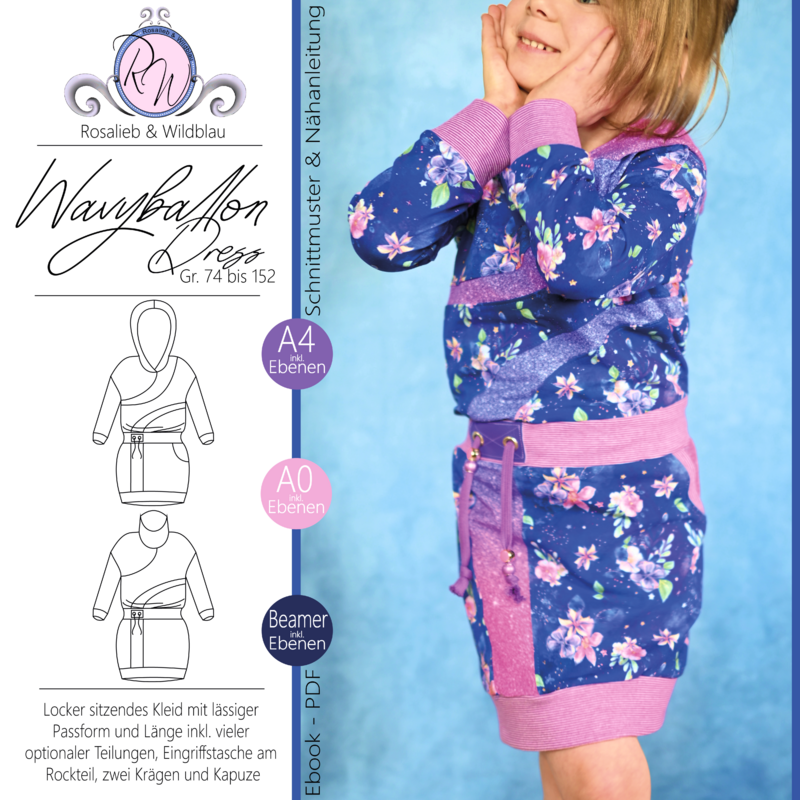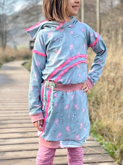 Das liegt zum einen an den unzähligen, möglichen Teilungsvarianten und zum anderen an der Möglichkeit, je nach Stoffwahl ein sportlich-lässiges Kleid, ein zuckersüßes Spielkleid oder ein liebevoll verziertes Prinzessinnenkleid mit Alltagstauglichkeit daraus zu nähen. Grundsätzlich besteht das Kleid aus einem locker geschnittenen Oberteil, einer durch ein Bündchen geteilten Mitte und einem Rockteil. Das Bündchen, das die Mitte des Kleides darstellt, sitzt auf Höhe der Hüfte und teilt das Kleid auch optisch durch einen zusammengezogenen Effekt. Am Abschluss des Kleides kannst du dich für einen Saum, Spitze oder ein Bündchen entscheiden, welches für einen Ballonlook sorgt. Die vielen gewellten Teilungen des Kleides können optional genutzt werden, bieten großen Spielraum für Tüddel und sorgen für den absolut coolen geteilten Look, falls dieser gewünscht ist. Die Teilungen können nämlich, falls auf diese Art gewählt, auch über die Kapuze, die Ärmel oder den Knopfleistenkragen übertragen werden, sodass all diese Teile aus jeweils zwei optisch verschiedenen Stoffen genäht werden können! Ebenso verhält es sich mit dem Rockteil. Zur Ergänzung der optionalen Kapuze gibt es einem etwas längeren, normalen Kragen und den Knopfleistenkragen, noch eine weitere frei wählbare Teilung und eine optionale Tasche welche auch durch Verwendung des Bruches auf beiden Seiten des Rockes genäht werden kann.