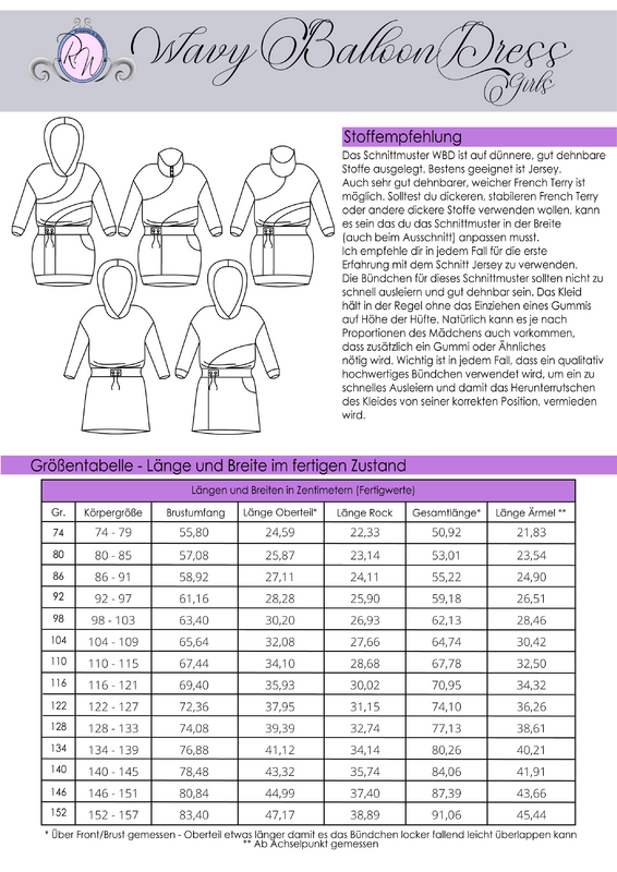 Das Schnittmuster ist in Echtgröße (du nähst hier nach echter Körpergröße) gradiert und enthält keine Naht- und Saumzugabe. Es umfasst die Größen 74 bis 152 und ist damit für eine Körpergröße zwischen 74 und 157cm geeignet. In den Dateien findest du die A4-Versionen zum Ausdrucken, eine Großdruck-Datei sowie die Beamerdatei - alle Versionen inkl. Ebenen zum Ein- und Ausblenden der Größen. WeavyballonDress ist auf Jersey ausgelegt.