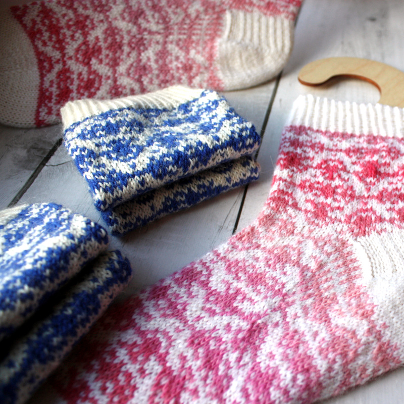 Die Fußspitzen, die Fersen und Bündchen werden in der Hauptfarbe (=Hintergrundfarbe) gestrickt.