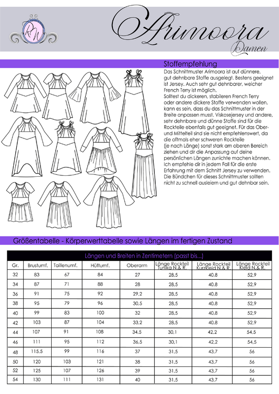 Hinweis: Das Schnittmuster enthält weder Naht- noch Saumzugabe und ist auf eine Größe von 164-165cm ausgelegt. Einfache Anpassungen sind im Ebook beschrieben. Arimoora ist in den Größen 32 bis 54 gradiert, auf gut dehnbare Stoffe wie Jersey ausgelegt und enthält in allen Dateien (A4, A0-Großdruck und Beamerdatei) Ebenen.
