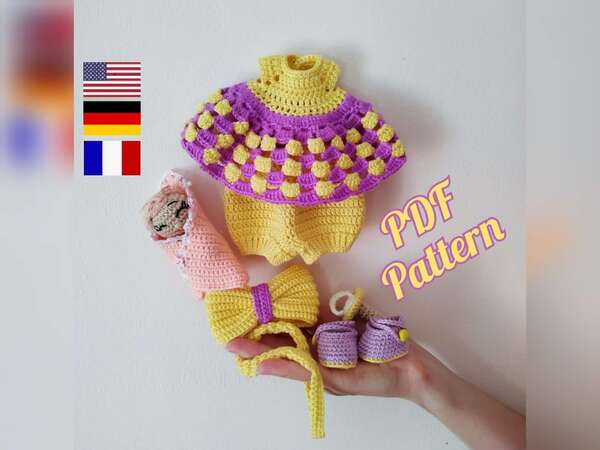 Größe: Für eine Puppe mit einer Höhe von 25 cm. Die Größe der Kleidung hängt von der Garnstärke und der Häkelnadelstärke ab. Ich habe die Häkelnadel 2 mm und verschiedene Garne verwendet.