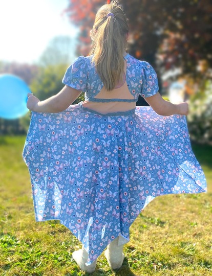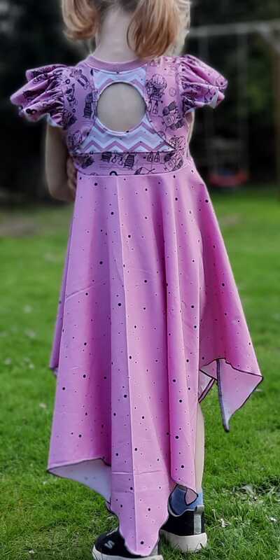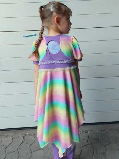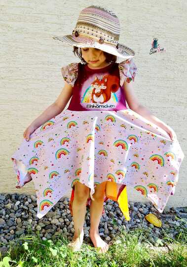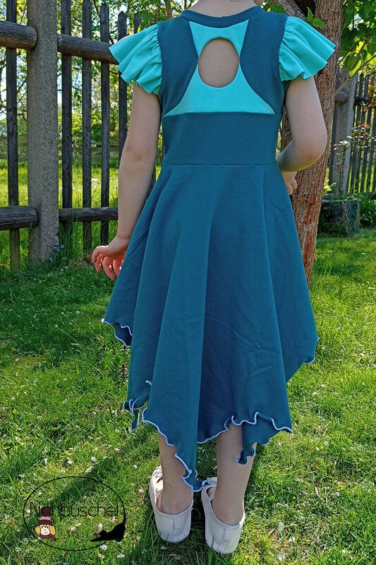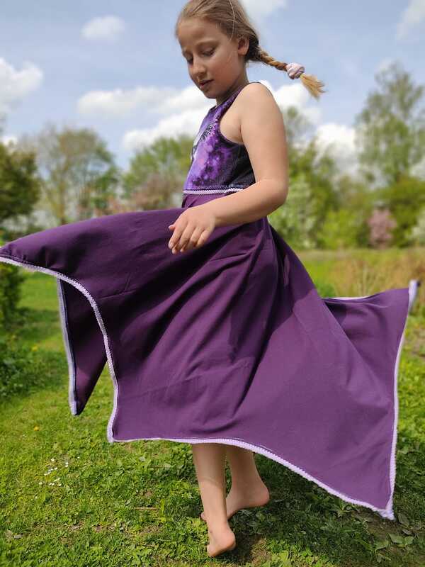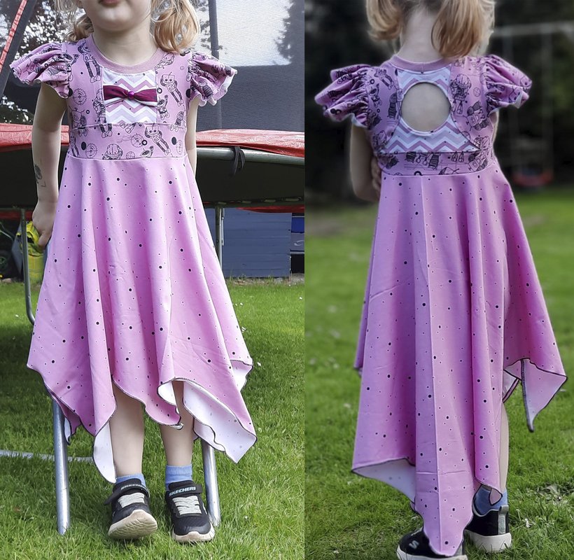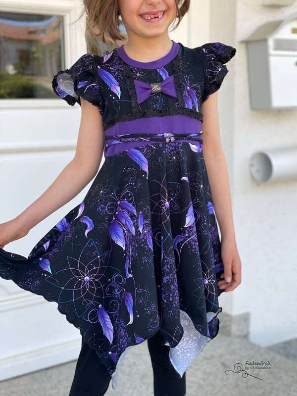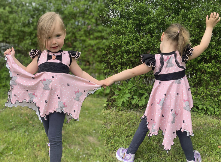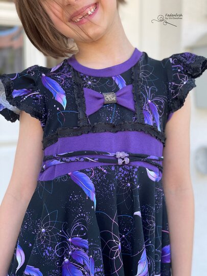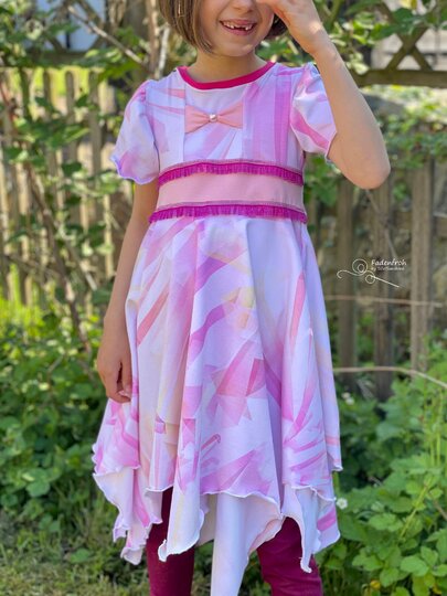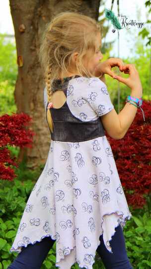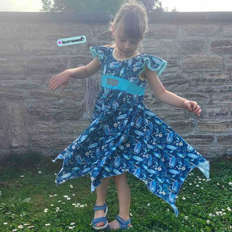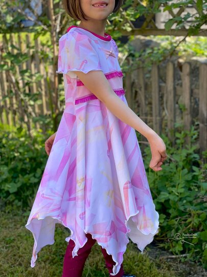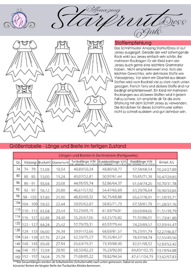Amazing StarfruitDress ist das Schnittmuster für eine Tunika, ein Kurzkleid oder ein langes Kleid. Es gibt viele tolle Möglichkeiten und alle Umsetzungen haben eines gemeinsam - einen in Spitzen endenden Tellerrock im Vokuhila-Stil! Das bedeutet, dass das Rockteil vorne immer kürzer als hinten ist. Das Schnittmuster verfügt über drei Längen des Rockteils und zwei Längen des oberen Bereiches. Die drei Längen des Rockteils ergeben entweder eine Tunika, ein Kurzkleid oder ein langes Kleid. Die zwei Längen des Oberteils unterscheiden sich lediglich etwas im fertigen Look. Das kürzere Mittelteil lässt das Rockteil etwas früher aufspringen und ergibt einen Look der etwas an ein Babydoll erinnert, das längere Mittelteil sorgt für eine ingesamt schmalere Optik. Neben dem wunderbar schwingenden Rockteil verfügt das Schnittmuster über viele optionale Teilungen. So gibt es auf der Front neben dem Mittelteil eine Mittelteilung, welche mit einer Schlaufe versehen werden kann. Auf dem Rückteil gibt es Seitenteilungen und einen optionalen Cut-Out, welcher auf zwei verschiedenen Wegen verarbeitet werden kann. Bei den Ärmeln gibt es Versionen für alle Wetterlagen und Jahreszeiten. So sind ein normaler Ärmel in kurz und lang, ein Puffärmel in kurz und lang sowie Flügelärmel oder eine Top-Version mit Bündchen enthalten. Besonders schön ist die imposante Variante mit mehreren Rocklagen.