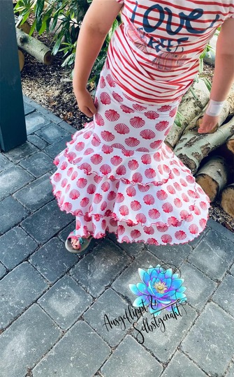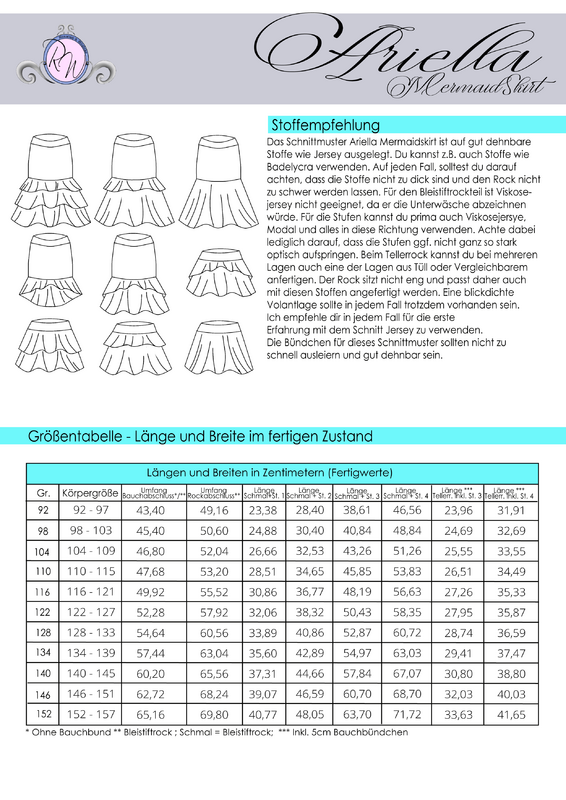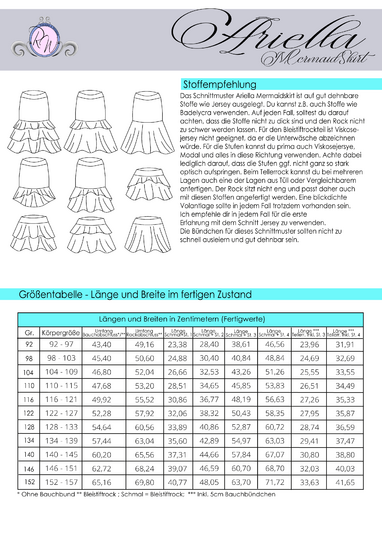 Hinweis: Das Schnittmuster ist in Echtgröße gradiert (Gr. 92 passt also z.B. mit einer Körpergr. von 92 - 97cm) und enthält weder Naht- noch Saumzugabe. Der optionale Saumbeleg, welcher eine Abschlussvariation der Stufen darstellt, ist als Tutorial im Schnittmusterenthalten.In den Dateien findest du die A4-Versionen zum Ausdrucken, eine A0-Datei sowie die Beamerdatei - alle Versionen inkl. Ebenen zum Ein- und Ausblenden der Größen. Ariella MermaidSkirt ist auf Jersey ausgelegt.