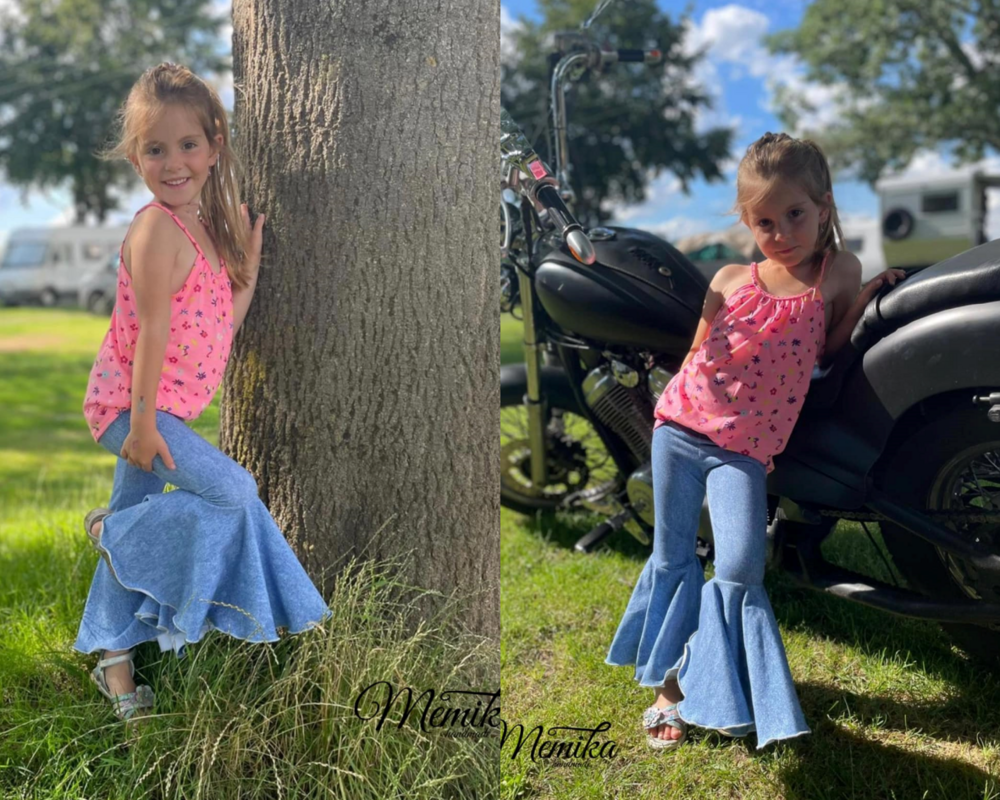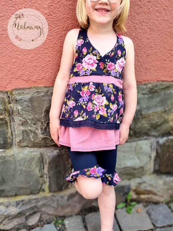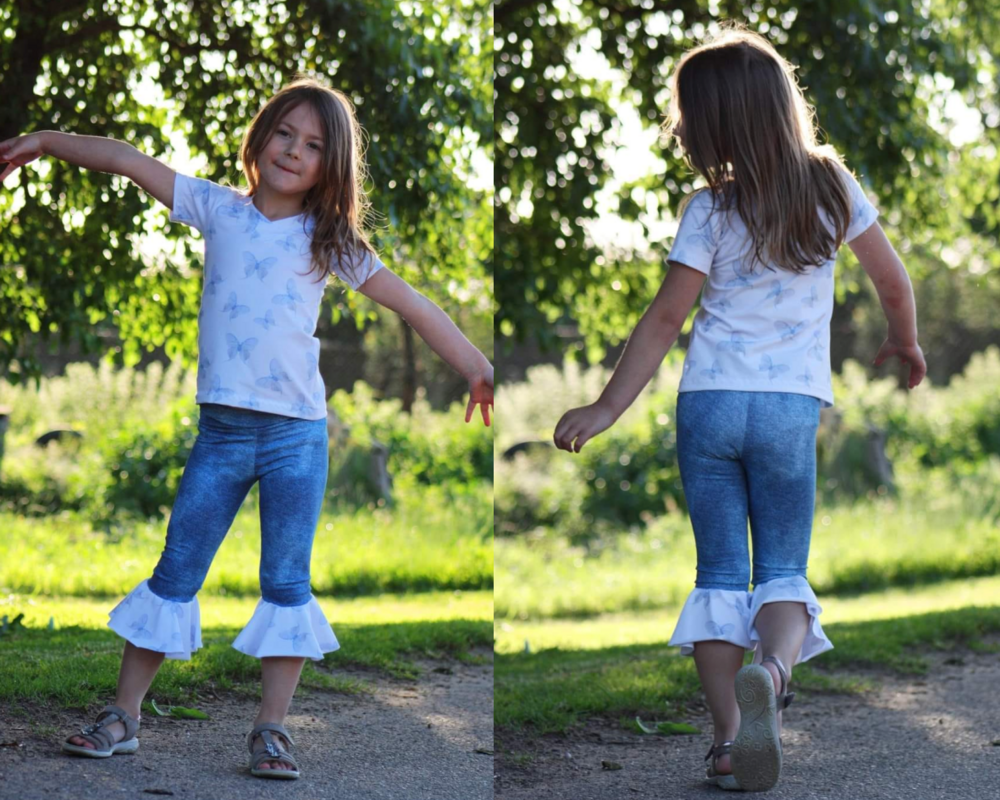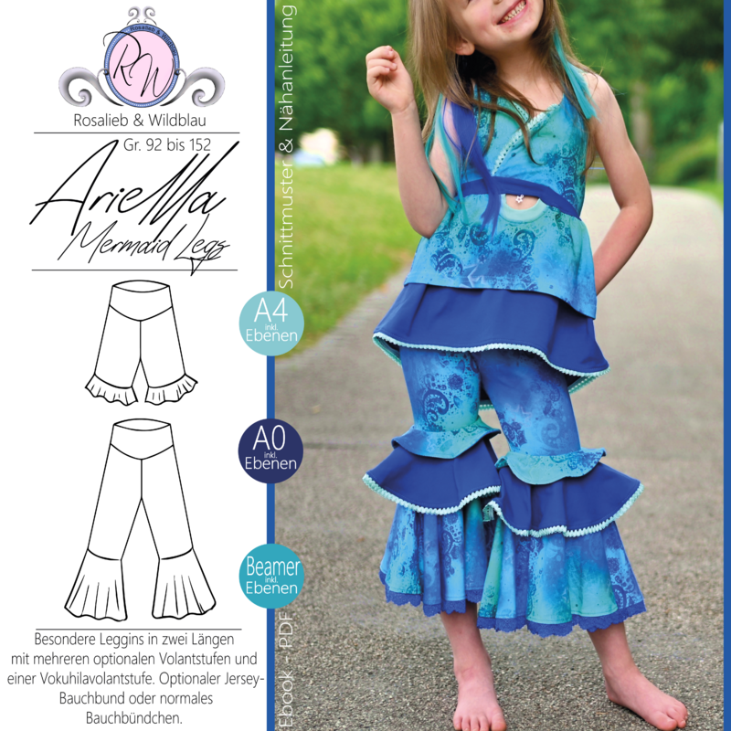 Diese coole Leggins ist Teil der Ariella-Serie und bietet dir die Möglichkeit, eine ganz besondere Hose in zwei Längen und mit mehreren optionalen Volantstufen zu nähen. Insgesamt 6 Volantstufen, die auf die Längen der Hose ausgelegt sind, versprechen immer wieder neue und aufregende Ergebnisse. Die schmal geschnittene Leggins kannst du in einer kurzen Version oder in einer Länge, die ich am ehesten als Radlerhosenlänge beschreiben würde nähen. Zur kurzen Länge passend gibt es drei Volantstufen, die am schmalen Bein wundervoll aufspringen. Zur zweiten Länge gibt es zwei Volantstufen, in der normalen Version und eine Vokuhilastufe, welche vorne kürzer und hinten länger, abschließt. Alle Stufen können in der jeweiligen Länge auch miteinander kombiniert werden und auf verschiedenste Art und Weise abgeschlossen werden. Ebenfalls im Schnitt enthalten ist ein Jerseybauchbund, welcher besonders gut zu Varianten mit weniger Stufen passt. Schwerere Hosen mit meheren Stufen werden am besten mit einem normalen Bauchbündchen genäht. Eine Anleitung dazu findest du ebenfalls in diesem Ebook. Als Abschlussvariante in diesem Ebook beschrieben, ist das Anbringen einer Spitze und eine doppellagige Nähweise. Diese eignet sich besonders gut für die Vokuhilastufe. Neben der Möglichkeit eines Saumbeleges (Tutorial enthalten) ist auch ein Rollsaum eine wirklich schöne Abschlussmöglichkeit für die einzelnen Stufen.