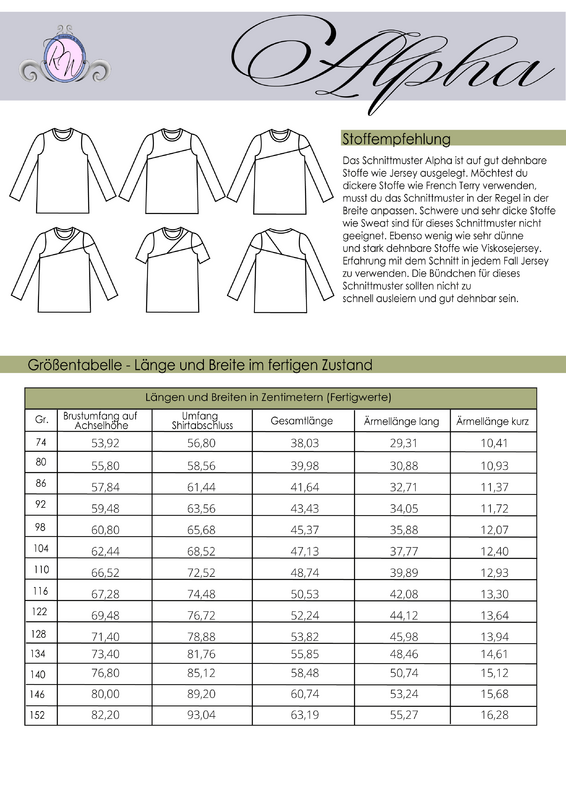 Das Schnittmuster ist in Echtgröße (du nähst hier nach echter Körpergröße) gradiert und enthält keine Naht- und Saumzugabe. Es umfasst die Größen 74 bis 152 und ist damit für eine Körpergröße zwischen 74 und 157cm geeignet. In den Dateien findest du die A4-Versionen zum Ausdrucken, eine Großdruck-Datei sowie die Beamerdatei - alle Versionen inkl. Ebenen zum Ein- und Ausblenden der Größen. Alpha ist auf Jersey ausgelegt.