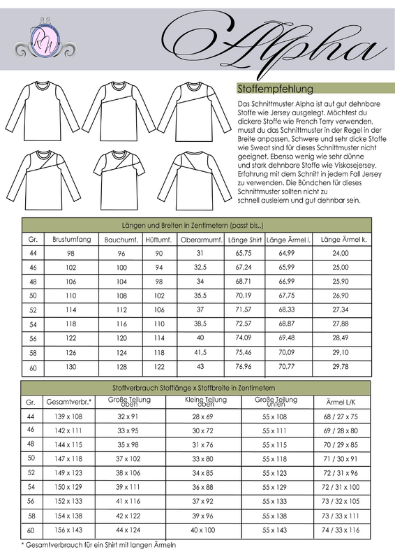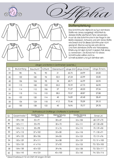 Das Schnittmuster enthält weder Naht- noch Saumzugabe. Enthalten sind eine A4 Druckversion inkl. Ebenen, einen A0 (Großdruck) Druckversion inkl. Ebenen sowie eine Beamerversion. Das Schnittmuster wird hauptsächlich aus Stoffen wie Jersey genäht. Alpha ist in den Größen 44 bis 60 gradiert.