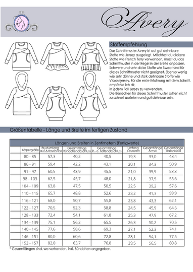 Das Schnittmuster ist in Echtgröße (du nähst hier nach echter Körpergröße) gradiert und enthält keine Naht- und Saumzugabe. Es umfasst die Größen 80 bis 152 und ist damit für eine Körpergröße zwischen 80 und 157cm geeignet. In den Dateien findest du die A4-Versionen zum Ausdrucken, eine Großdruck-Datei sowie die Beamerdatei - alle Versionen inkl. Ebenen zum Ein- und Ausblenden der Größen. Avery ist auf Jersey ausgelegt.
