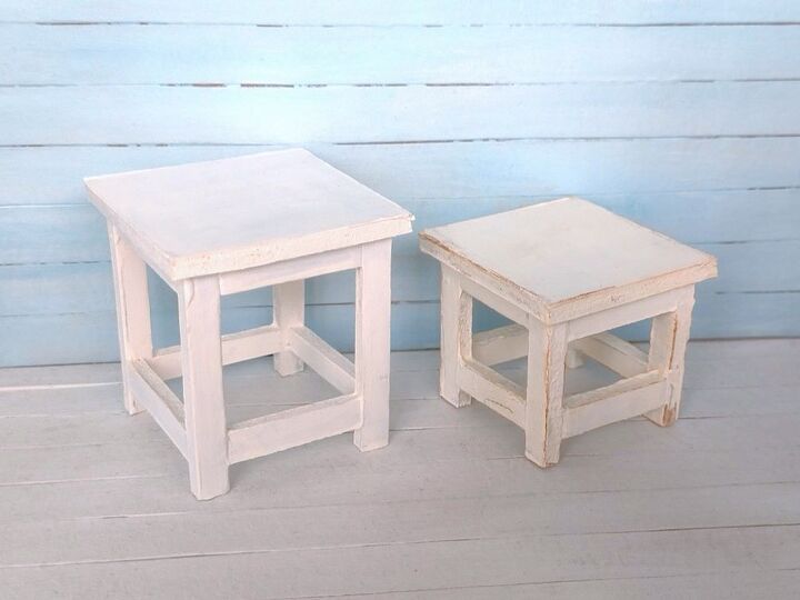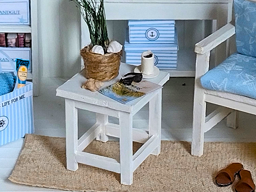 Mit Hilfe dieser bebilderten Schritt-für-Schritt-Anleitung kannst du dir einen Miniatur-Beistelltisch und einen Miniatur-Hocker im Maßstab 1:12 aus Foamboard, Pappe oder Holz basteln.