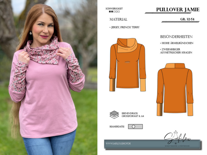 PDF-Schnittmuster Pullover Jamie (Gr. 32-54) – Entdecke den perfekten Begleiter für jede Gelegenheit mit dem Pullover Jamie!Dieser modische Pullover überzeugt durch seine einzigartigen Details und die bequeme Passform. Der zweifarbige, asymmetrische Kragen verleiht ihm einen besonderen Charme und macht ihn zu einem echten Hingucker. Die hohen Ärmelbündchen sorgen für einen lässigen Look und halten deine Arme warm, während der weiche Stoff für maximalen Komfort sorgt.Hauptmerkmale: