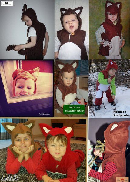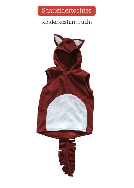 Das Kinderkostüm Fuchs wird aus +Fleece+ genäht. Das Kostüm besteht aus einem ärmellosen Überzieher mit Kapuze und Schwanz, der am Hals mit einem Knopf geschlossen wird.