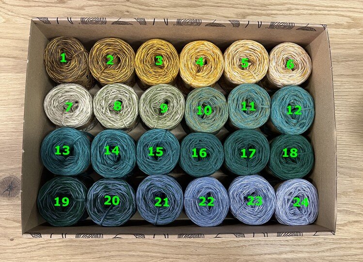 24 X 95m Lola 4fädig in aufeinanderfolgenden Farben + 750m Lola 4fädig in Kontrastfarbe (petrol). Natürlich kannst du auch mit "nur" zwei, drei oder vier Farben stricken. Vier 700m Bobbel sollten dafür locker reichen.