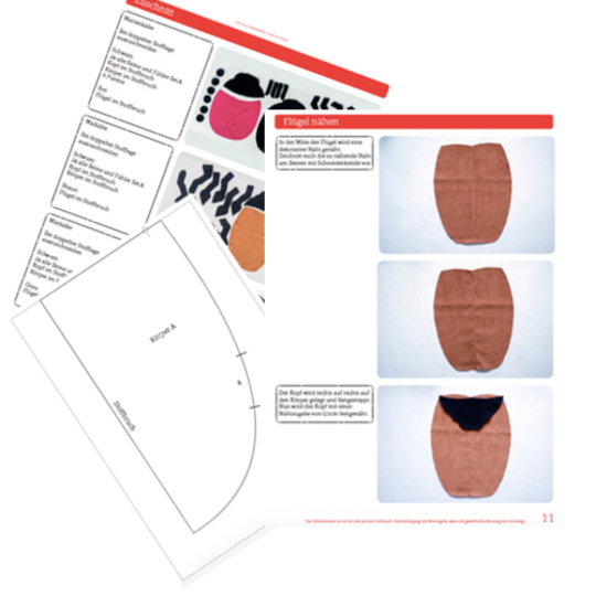 Die Käfer können aus verschiedenen Stoffen genäht werden. Das Schnittmuster beinhaltet Käfer in drei Variationen. Es können ein Mistkäfer, ein Maikäfer und ein Marienkäfer genäht werden.