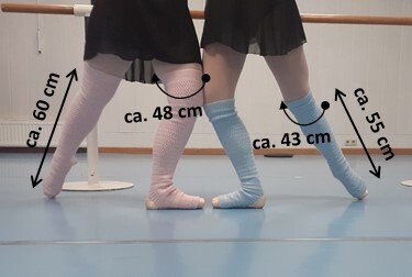 Die rosafarbenen Ballettstulpen sind ca. 60 cm lang und für einen Umfang am Oberschenkel von ca. 48 cm passend. Die hellblauen Ballettstulpen sind ca. 55 cm lang und für einen Umfang am Oberschenkel von ca. 43 cm passend.