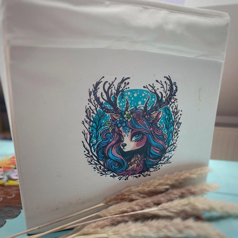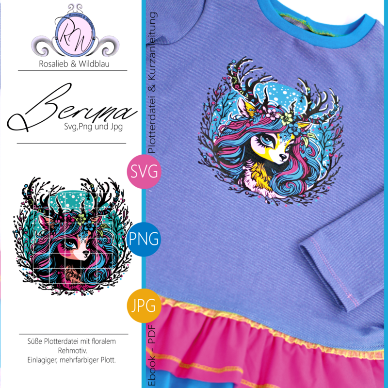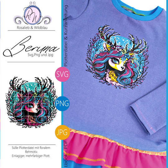 Beruna ist ein süßes Motiv im Comic-Stil umringt von magisch wirkenden Blütenzweigen. Mit ihren Blumen im Haar und dem geschmückten Geweih wirkt sie mystisch und verspielt zugleich und ist perfekt für alle, die den Mix aus Comic und Magie mögen :)!