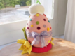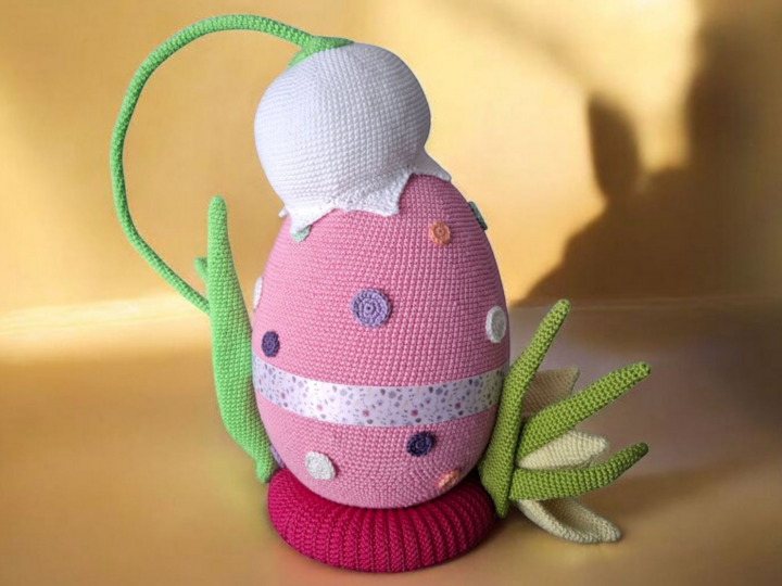 Ich arbeite hauptsächlich mit 100% Baumwolle und einer Nadelstärke von 2,0. Wenn Du mit Carina (vergleichbar mit Schachenmayr Catania oder Catona) arbeitest, wird das Ei mit Blume ca.35cm hoch.