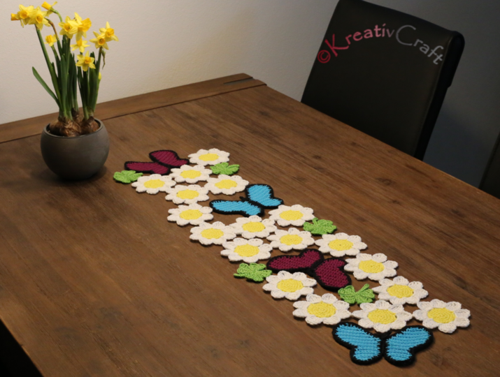 In meiner Häkelanleitung erkläre ich dir anhand einer detaillierten Beschreibung samt anschaulicher, mit Detailhinweisen versehener Bilder jeden einzelnen Schritt, damit du das Tischband Frühlingszeit spielend leicht häkeln kannst.