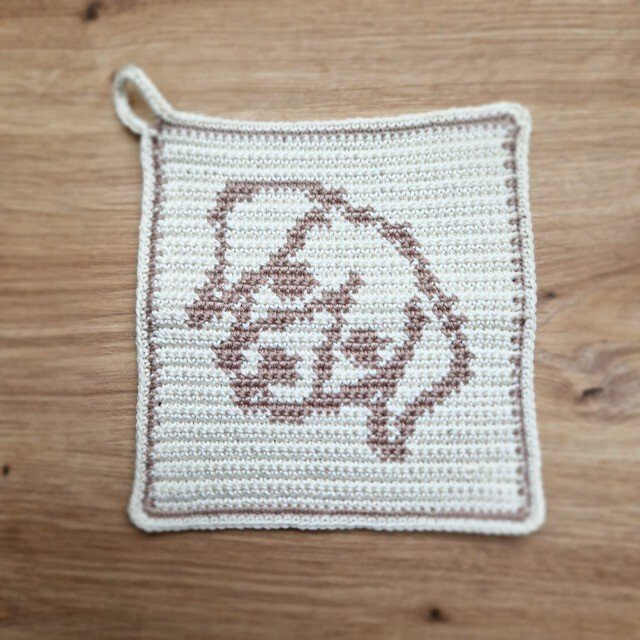 Mit der von mir verwendeten Wolle hat der Topflappen eine Größe von ca 20cm x 20cm