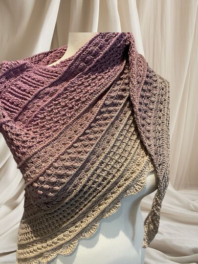 Das Tuch wurde aus dem Farbverlaufsbobbel "Schneeflöckchen" von Wollfamos/Yarnbox gehäkelt. Verbraucht wurden etwa 1400m, 4-fädiges Garn.