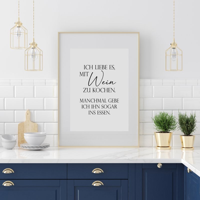 MOTIV: Ein liebevoll gestaltetes Poster mit dem Spruch "Ich liebe es, mit Wein zu kochen. Manchmal gebe ich ihn sogar ins Essen."