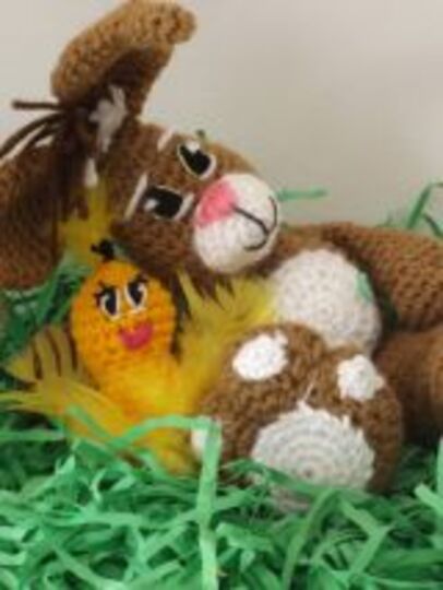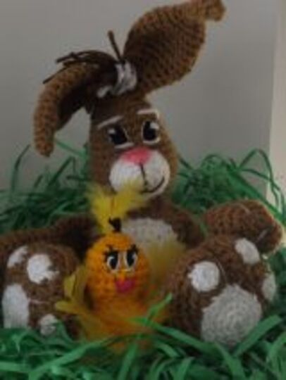 Der Osterhase ist sitzend ca. 25cm groß, das Küken 10 cm.