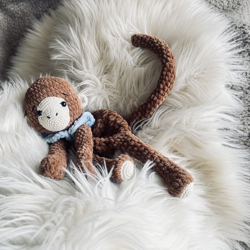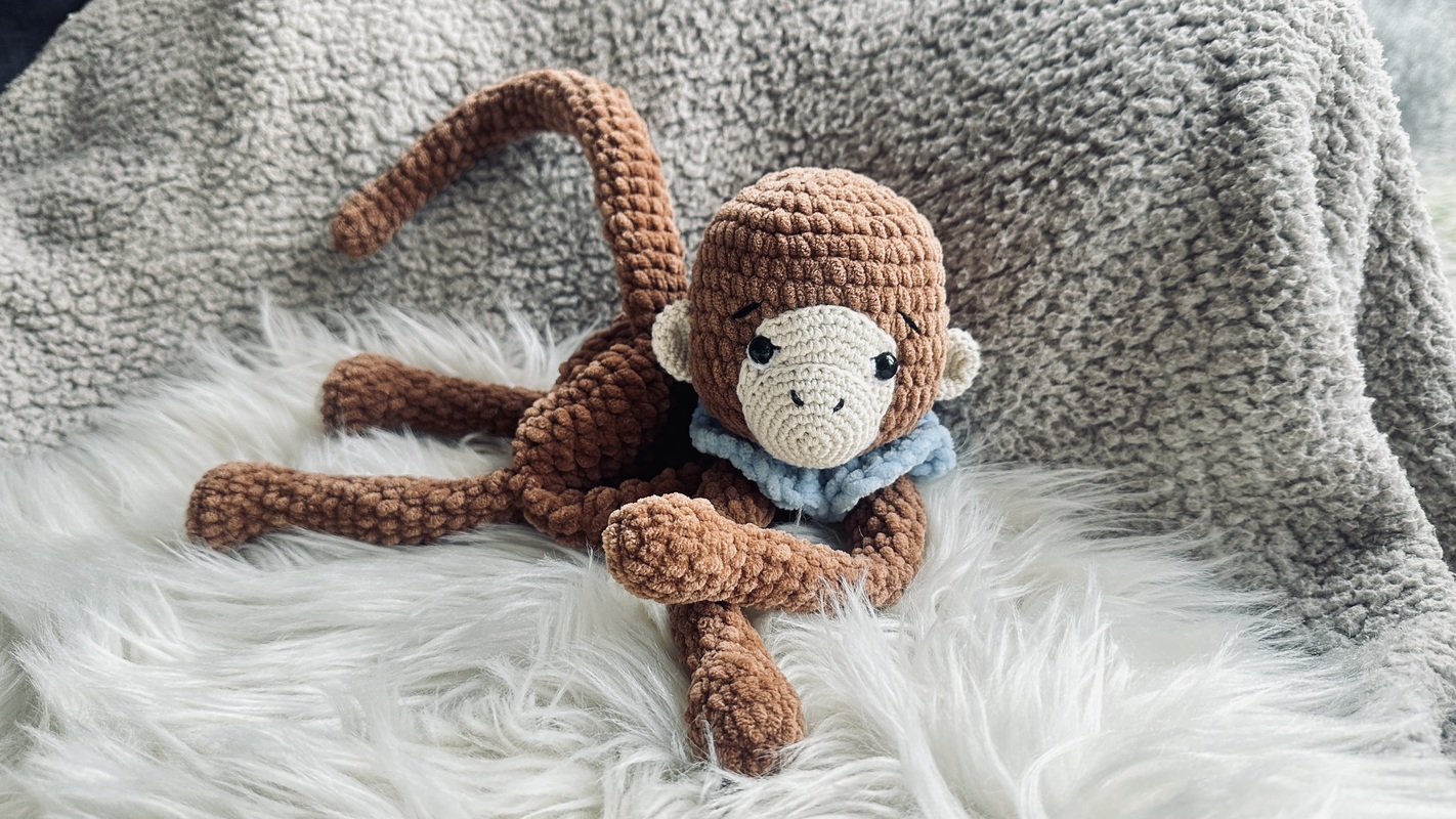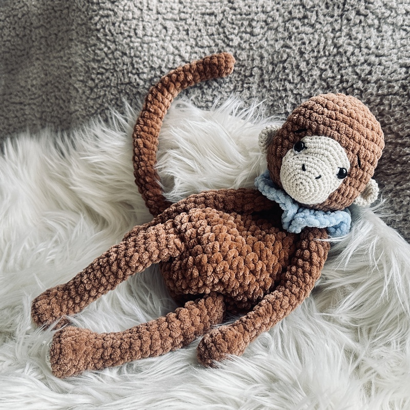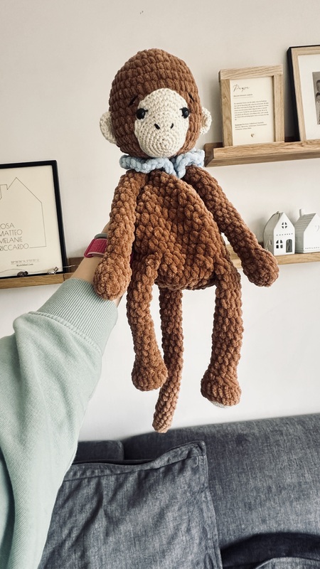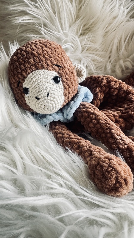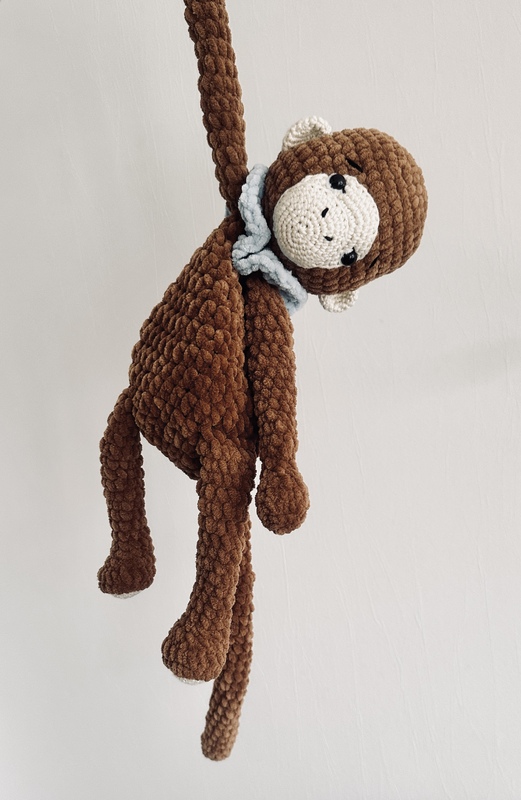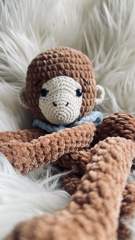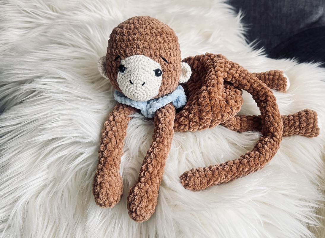 Das fertige Äffchen misst ca. 40 cm (von Kopf – Fuß gemessen, ohne Schwanz).