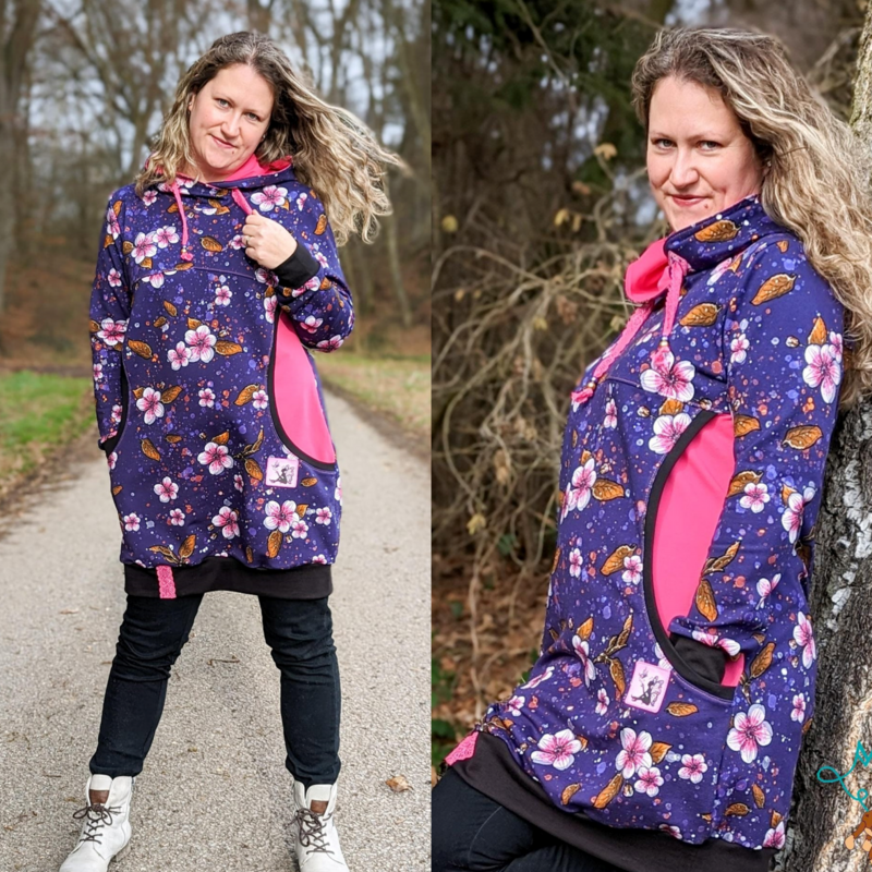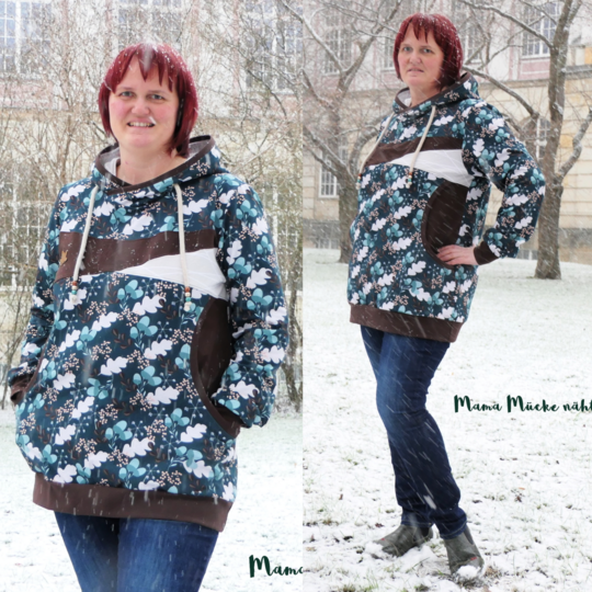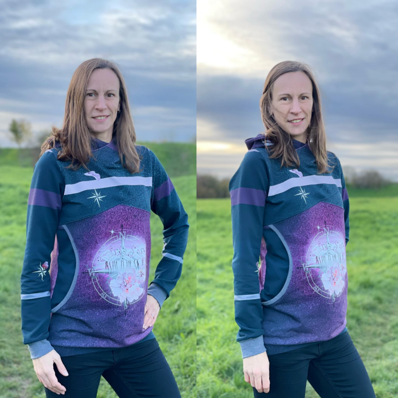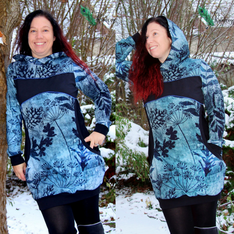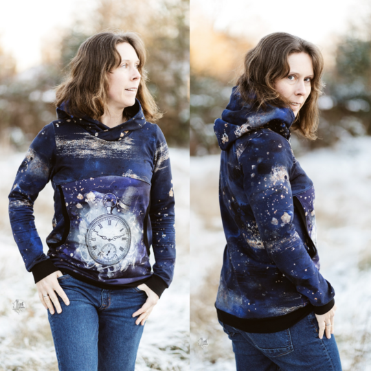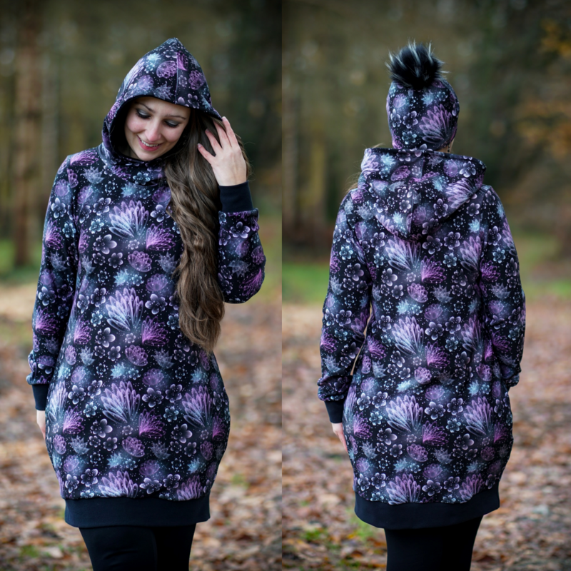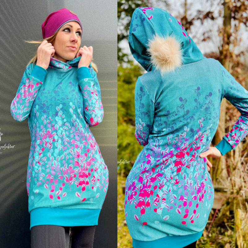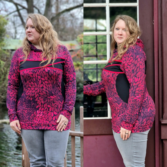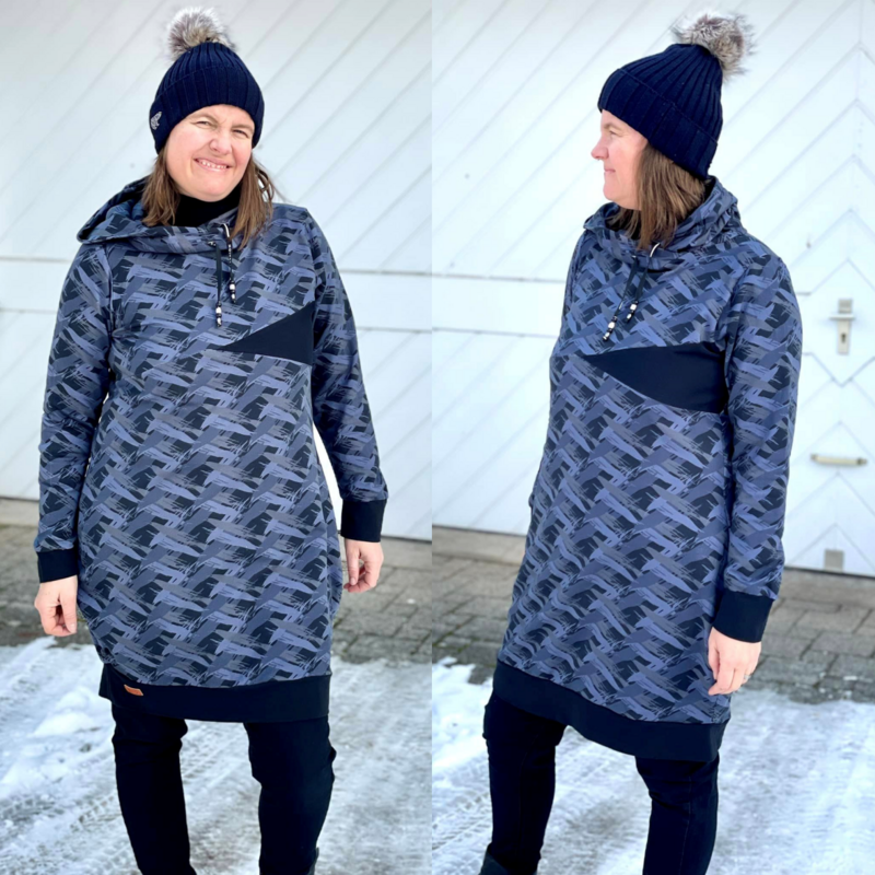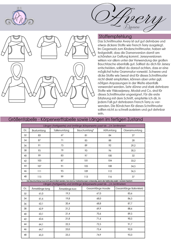 Avery ist ein sehr vielseitiges Schnittmuster für ein Kapuzenshirt mit Wickelkapuze und großer Fronttasche. Neben der normalen „Form“ als Kapuzenshirt sind auch noch Schnittmusterteile für ein Ballonkleid enthalten! Grundsätzlich bietet dir Avery mehrere Teilungen, welche du optional verwenden kannst. Damit steht wilden Stoffmusterkombinationen nichts im Wege und auch Tüddel lässt sich hier so schön verarbeiten! Auf der Front kannst du neben den Teilungen auch eine große Tasche anbringen. Bei den Kapuzen handelt es sich stets um Wickelkapuzen. Hier hast du die Auswahl zwischen einer normalen Kapuze und einer Spitzkapuze, aber natürlich kannst du Avery auch einfach mit einem Halsbündchen nähen. Der Abschluss des Damenschnittmusters wird stets mit einem Bündchen versehen. Avery für Damen verzichtet komplett auf Abnäher und hat eine lockere, angenehme Passform. Damit sich am Rückteil der Stoff ohne Abnäher nicht zu sehr staucht, sind diese bereits in der Seitennaht integriert. Wundere dich also nicht, dass Vorder- und Rückteil nicht exakt die gleiche Seitenlinie haben. Das Ballonkleid ist in der gleichen Form gehalten wie das Kinderschnittmuster. Der Balloneffekt ist hier allerdings etwas abgemildert. Natürlich bietet auch die Damenversion des Schnittmusters die Möglichkeit kurze Ärmel zu nähen, sodass wieder für jede Jahreszeit etwas dabei ist.