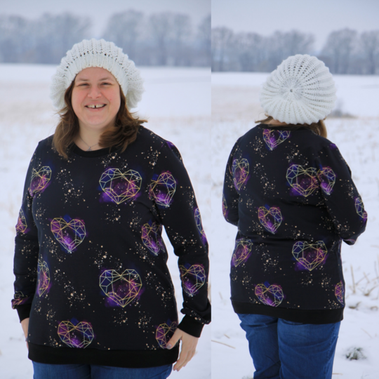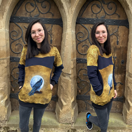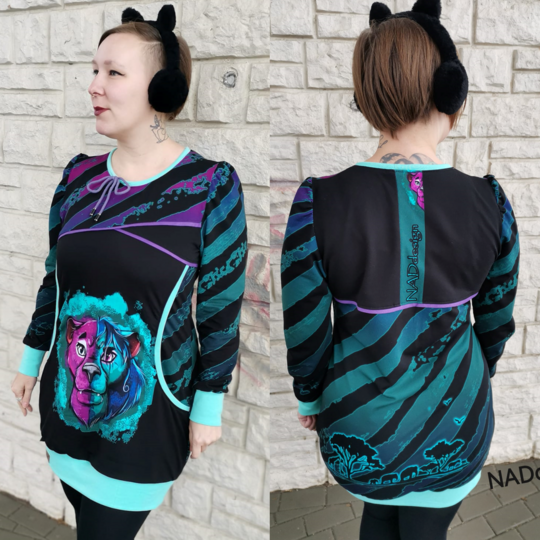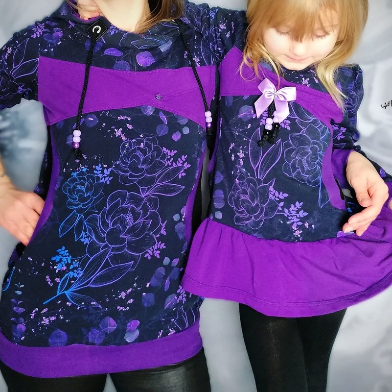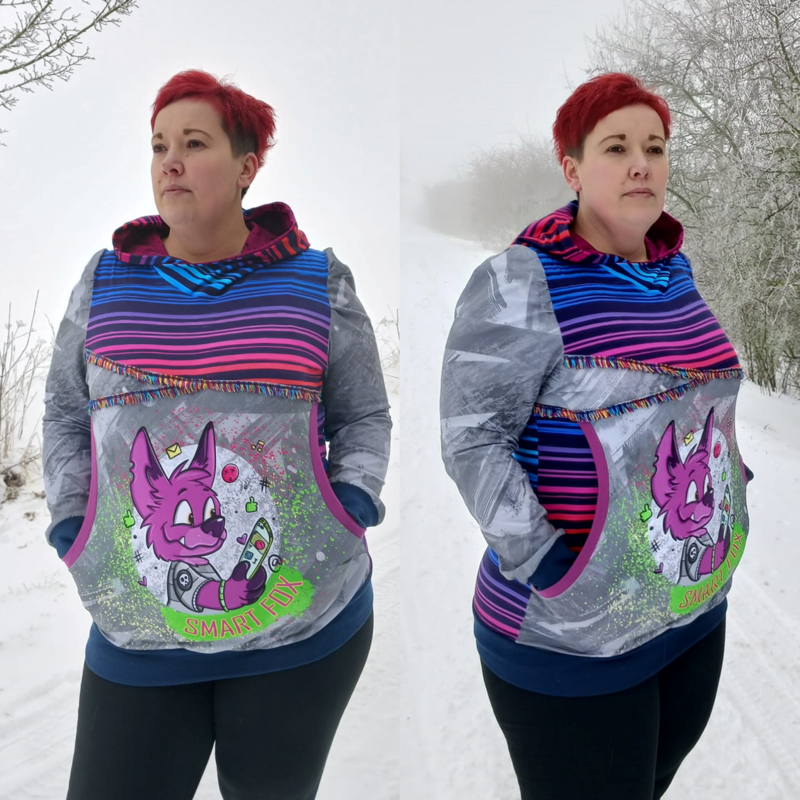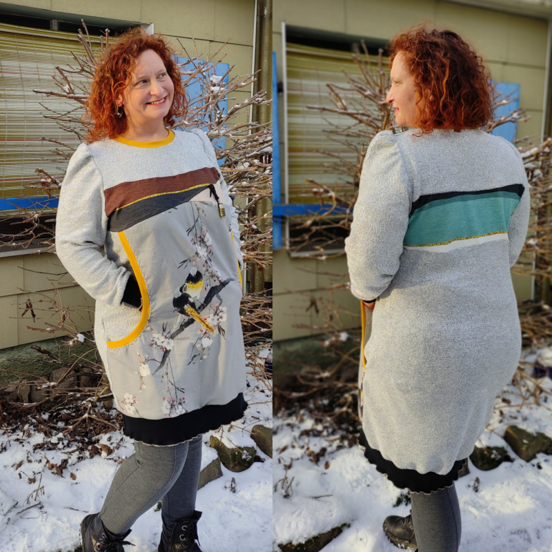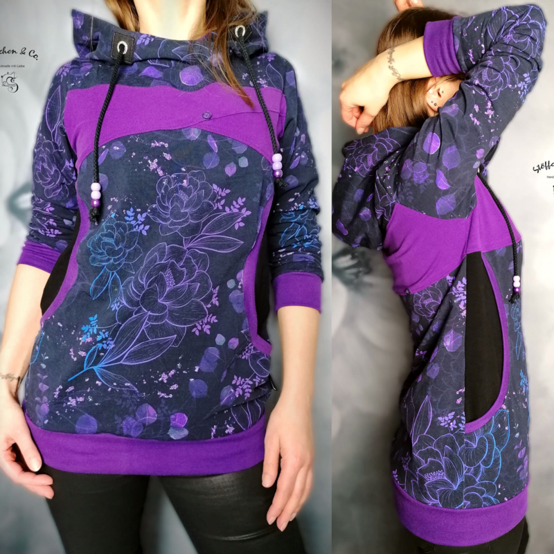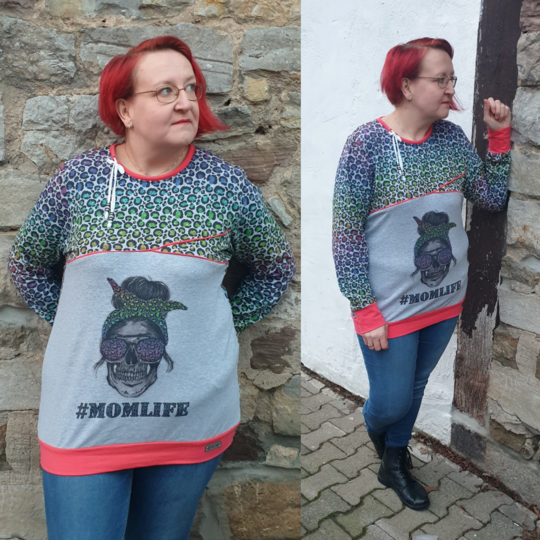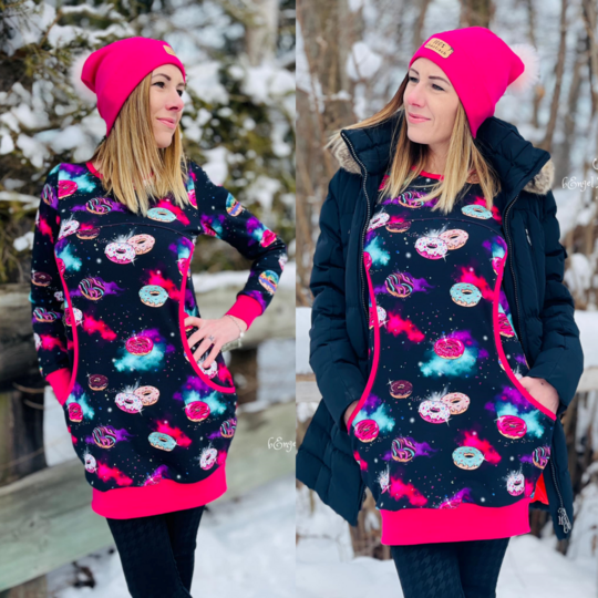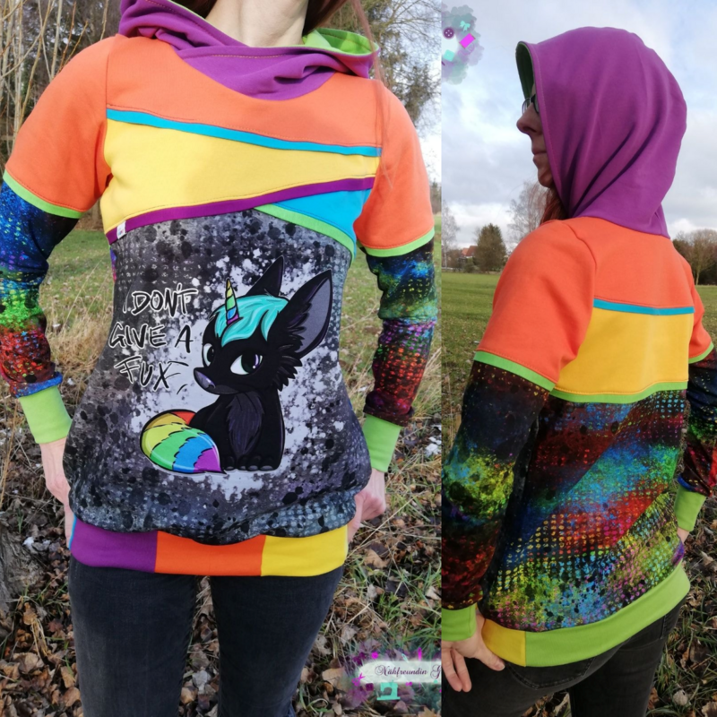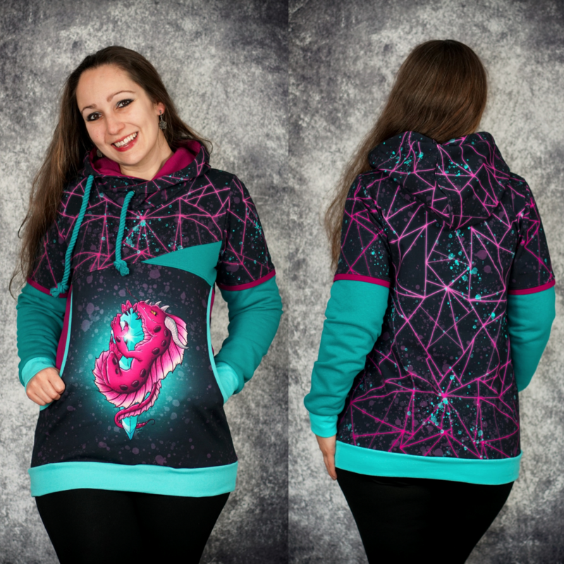 Avery ist ein sehr vielseitiges Schnittmuster für ein Kapuzenshirt mit Wickelkapuze und großer Fronttasche. Neben der normalen „Form“ als Kapuzenshirt sind auch noch Schnittmusterteile für ein Ballonkleid enthalten! Grundsätzlich bietet dir Avery mehrere Teilungen, welche du optional verwenden kannst. Damit steht wilden Stoffmusterkombinationen nichts im Wege und auch Tüddel lässt sich hier so schön verarbeiten! Auf der Front kannst du neben den Teilungen auch eine große Tasche anbringen. Bei den Kapuzen handelt es sich stets um Wickelkapuzen. Hier hast du die Auswahl zwischen einer normalen Kapuze und einer Spitzkapuze, aber natürlich kannst du Avery auch einfach mit einem Halsbündchen nähen. Der Abschluss des Damenschnittmusters wird stets mit einem Bündchen versehen. Avery für Damen verzichtet komplett auf Abnäher und hat eine lockere, angenehme Passform. Damit sich am Rückteil der Stoff ohne Abnäher nicht zu sehr staucht, sind diese bereits in der Seitennaht integriert. Wundere dich also nicht, dass Vorder- und Rückteil nicht exakt die gleiche Seitenlinie haben. Das Ballonkleid ist in der gleichen Form gehalten wie das Kinderschnittmuster. Der Balloneffekt ist hier allerdings etwas abgemildert. Natürlich bietet auch die Damenversion des Schnittmusters die Möglichkeit kurze Ärmel zu nähen, sodass wieder für jede Jahreszeit etwas dabei ist.