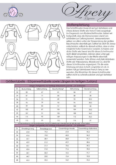 Das Schnittmuster ist auf eine Körpergröße von 164-165cm ausgelegt. Im Schnittmuster enthalten sind die Nähgrößen 32 bis 48.