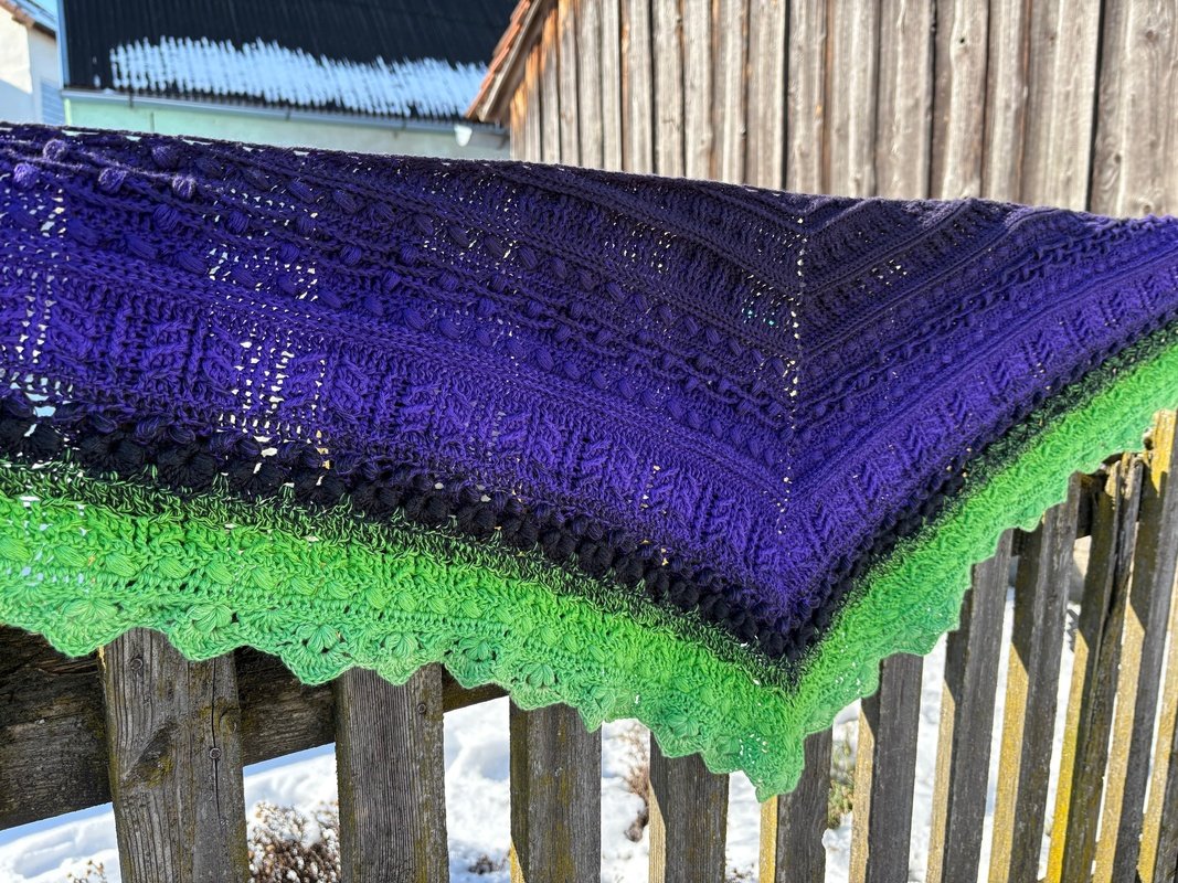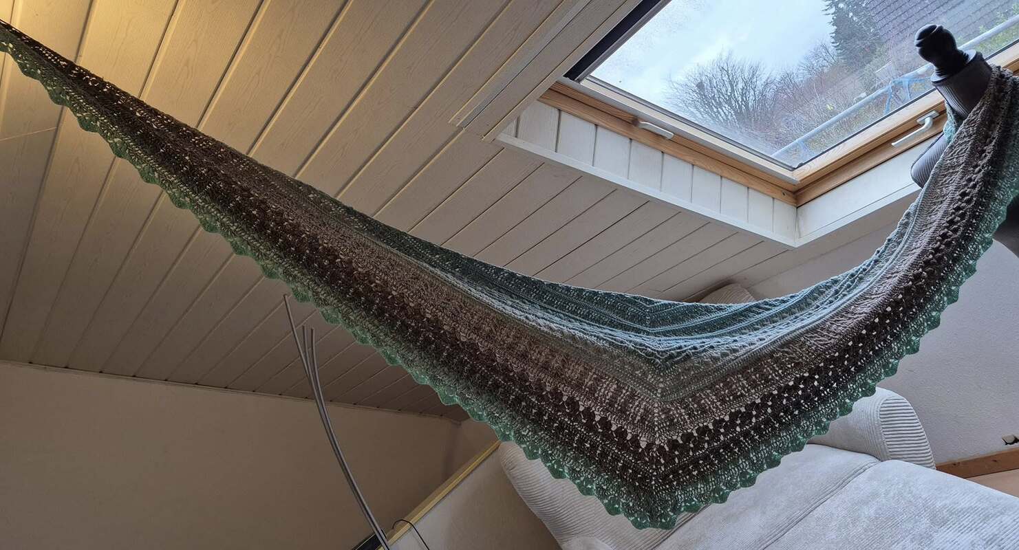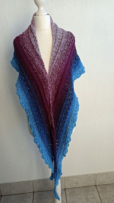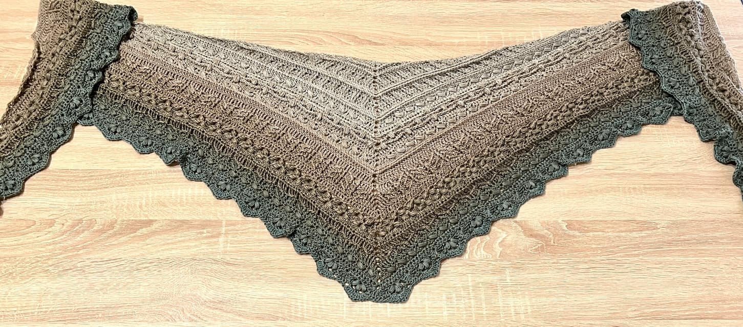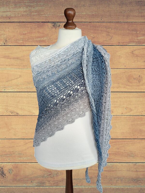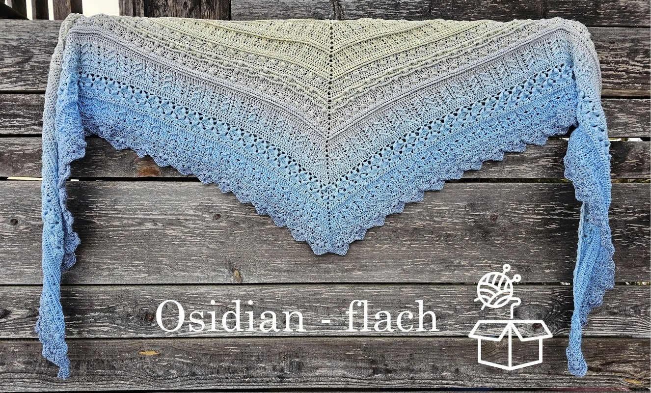 Bei „Osidian Flach“ handelt es sich um ein Dreieckstuch, welches klassisch von der Mitte aus gehäkelt wird, aber sehr stark in die Breite wächst.