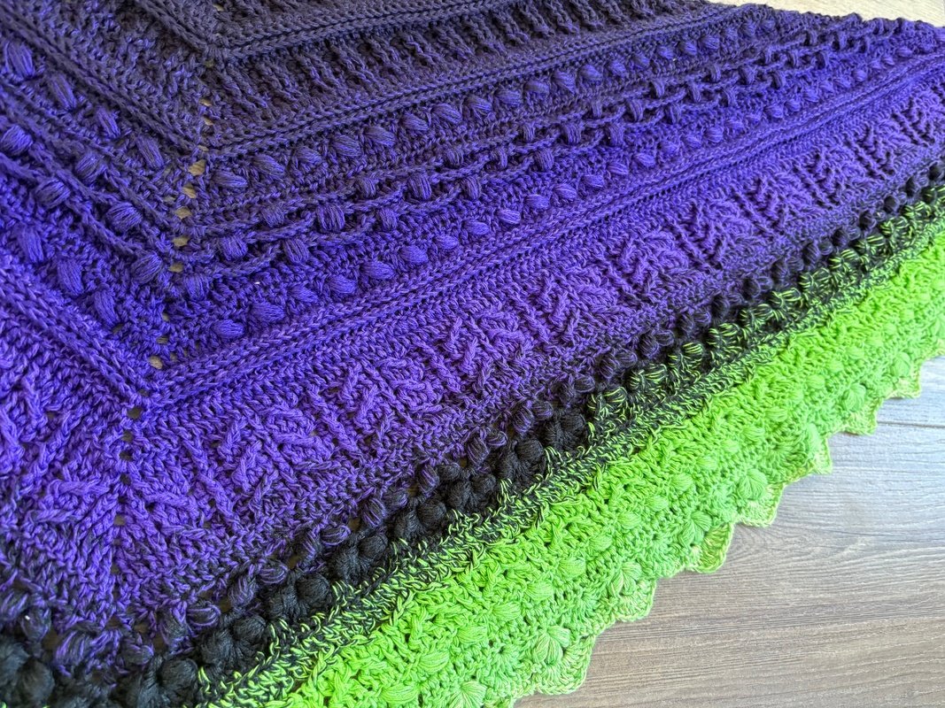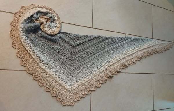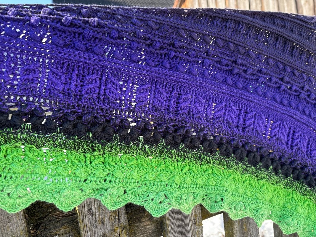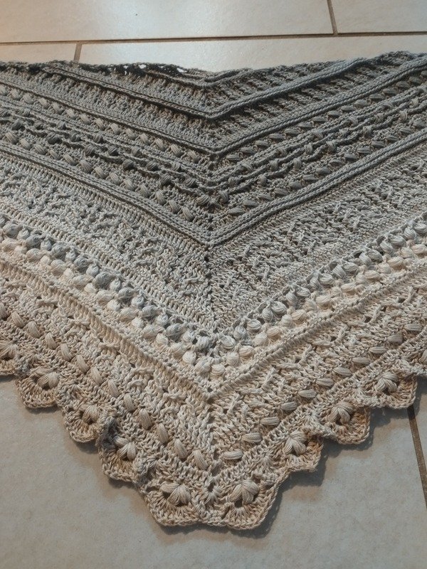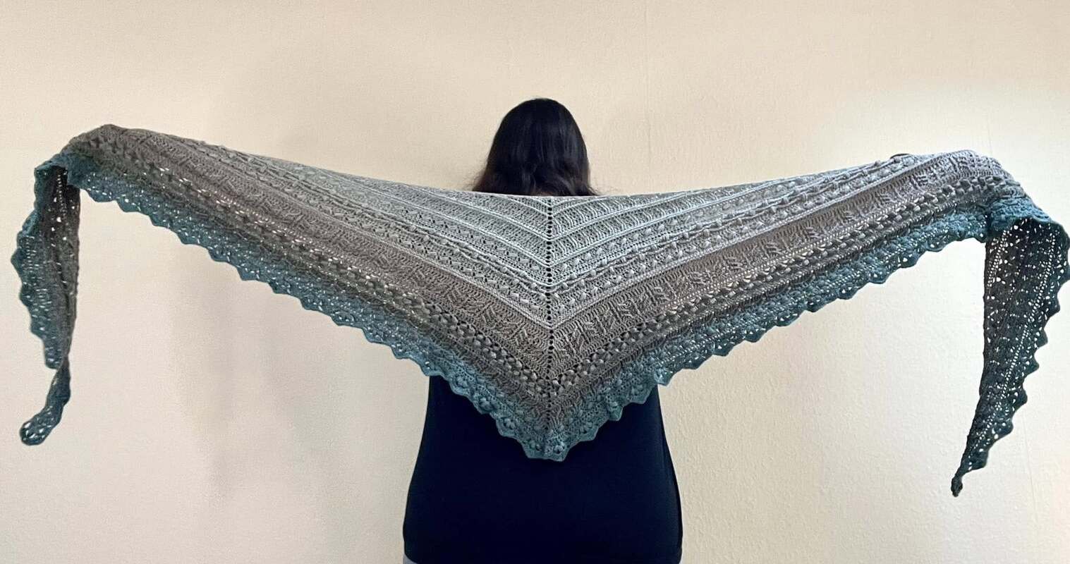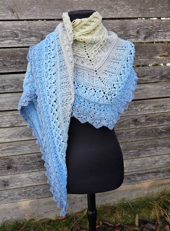Bei „Osidian Flach“ handelt es sich um ein Dreieckstuch, welches klassisch von der Mitte aus gehäkelt wird, aber sehr stark in die Breite wächst.