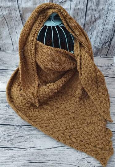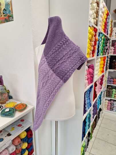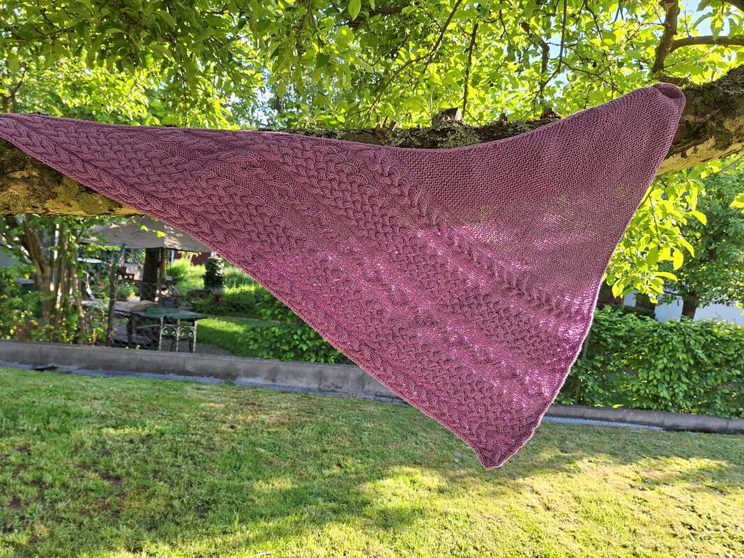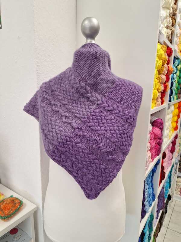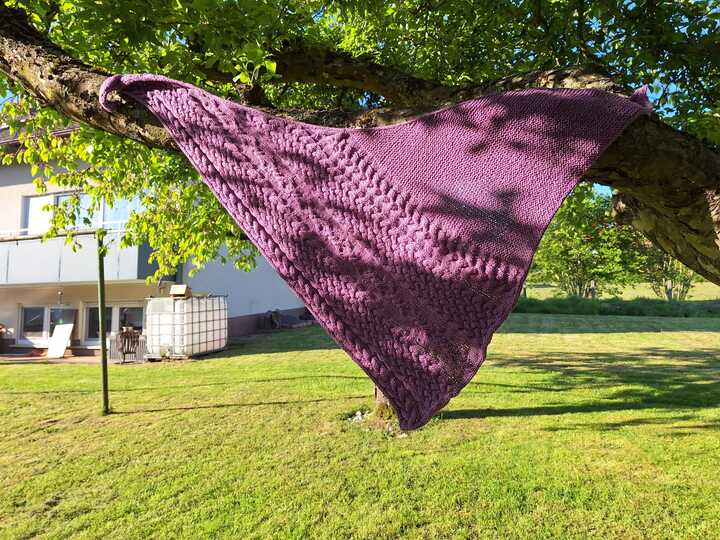 Dies ist eine Anleitung für ein leicht asymmetrisches Dreieckstuch. Die Anleitung besteht aus einer Strickschrift (Chart) und einer schriftlichen Anleitung in Tabellenform.