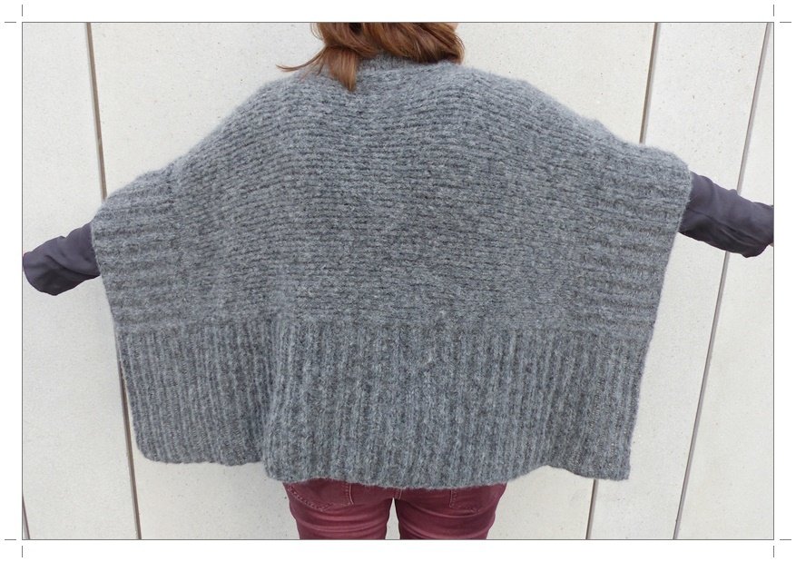 Eine gut verständliche Strickanleitung für einen Poncho mit breit gerippten Säumen. Der Poncho hat einen hohen Rollkragen.