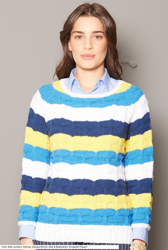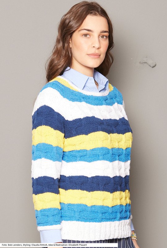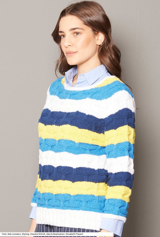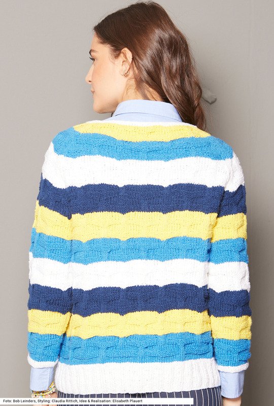 Boucléartiges Garn und Streifen prädestinieren diesen Raglanpullover für sportliche Outfits – dazu gehört auch die bequeme Weite. Die glatt rechts und glatt links gestrickten Streifen werden innerhalb der jeweiligen Farbe mit Hebemaschen verbunden. Die Raglanschrägungen werden durch glatt rechts gestrickte Abnahmen betont. Der Bund ist im Rippenmuster, die schmale Saumblende an den Ärmeln glatt links und die Halsausschnittblende kraus links gestrickt. Eine Anleitung für ein Garn aus Baumwolle und Polyamid gibt es für die Größen 38/40, 42 – 46 und 48 – 52.