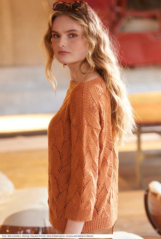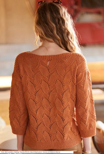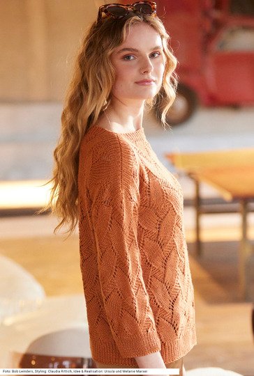 Elegant, mit dreiviertellangen Ärmeln bist du mit diesem Pulli stilsicher unterwegs, sowohl im Büro als auch bei einer Abendveranstaltung. Der Pullover mit geradem Halsausschnitt besticht mit seinem Rauten-Ajourmuster, das einen weichen, harmonischen Look erzeugt, der üppige Blüten und Ranken erinnert. Alle Teile sind ganz gerade geschnitten, sodass das Zusammennähen ein Kinderspiel ist. Die Bündchen sind im Rippenmuster gearbeitet, ebenso die über die ganze Breite gestrickte Blende an Schultern und Halsauschnitt. Die Anleitung für ein Garn aus Viskose, Baumwolle, Leinen und Polyamid gibt es für die Größen 36/38, 42/44 und 48/50.