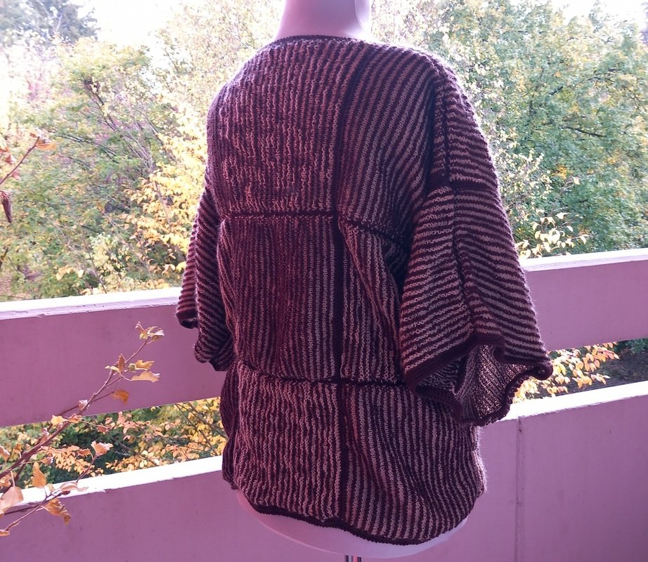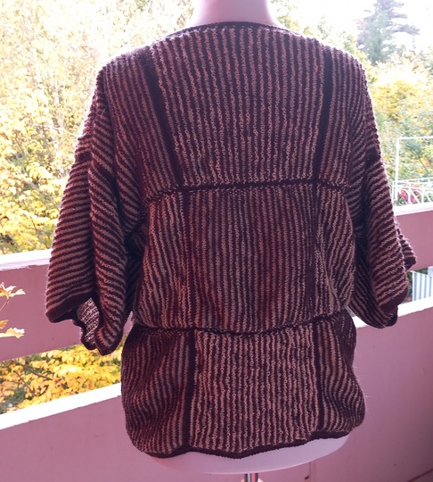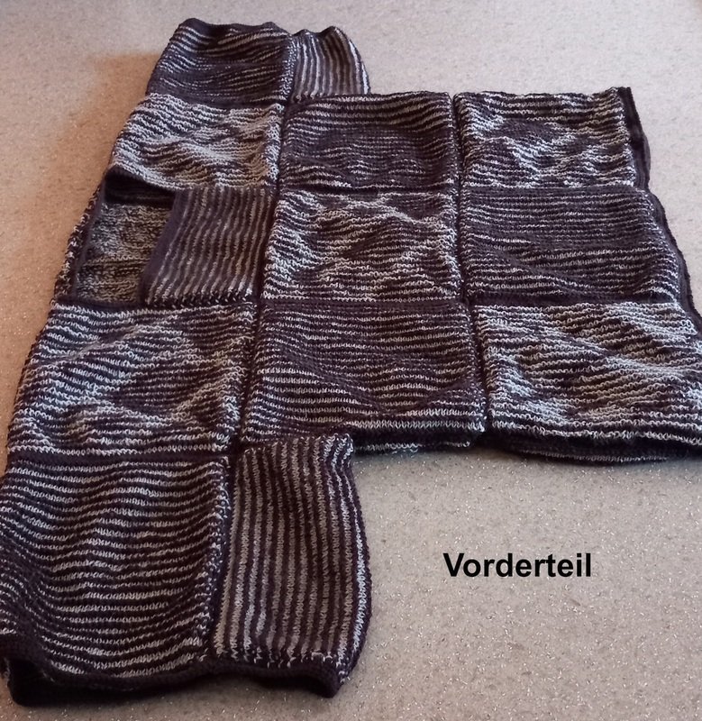 Mein Beispiel-Poncho sitzt locker bei Größe 44. Ein vergleichbarer Poncho ab Größe 50 dürfte jeweils ein Knäuel (also etwa 200 m) jeder Farbe mehr verbrauchen, bei Größe 38 wäre es jeweils ein Knäuel weniger.