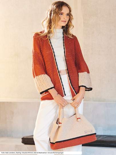 Mit diesem Set bist du fürs Büro perfekt angezogen. Die quer gestrickte, verschlusslose Jacke ist dezent, bekommt aber dank der breiten Ajourmuster-Bordüre mit gehäkeltem Abschluss an den Vorderteilen eine besondere Note. Die gehäkelte, stabile Tasche ergänzt den Look. An der Tasche ist noch ein kleines Gimmick: ein Label. Das Ajourmuster wiederholt sich bei den Ärmeln. Dank des Garns aus Baumwolle und Kaschmir sind beide Modelle wunderbar angenehm zu tragen. Eine Anleitung gibt es für die Größen 38/40, 44/46 und 50/52, Tasche: 28 x 48 cm.