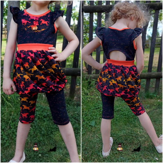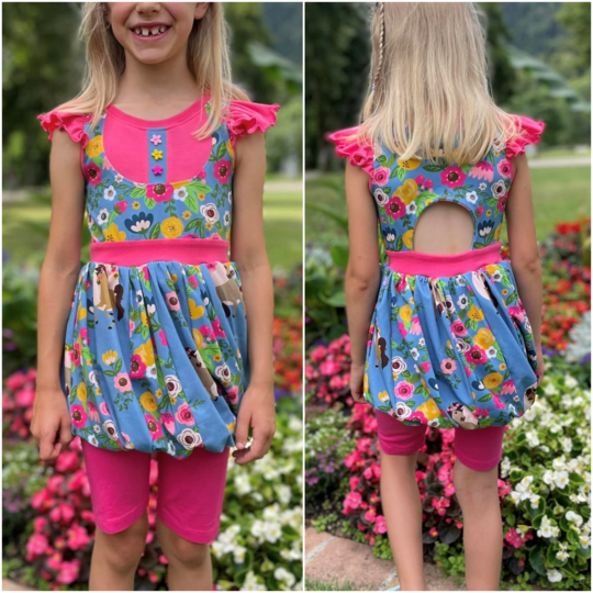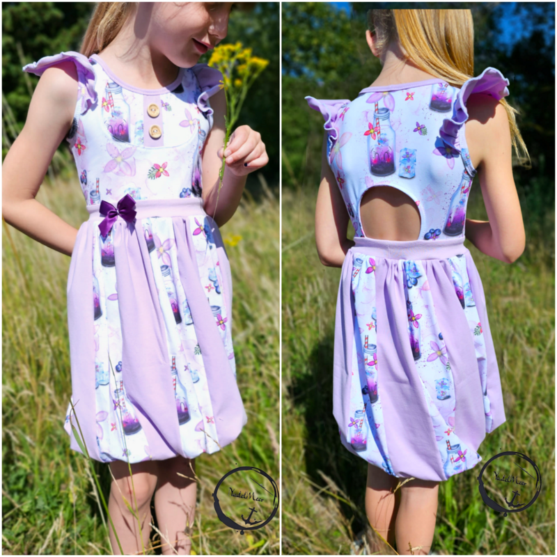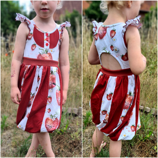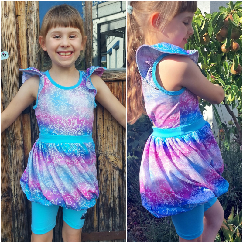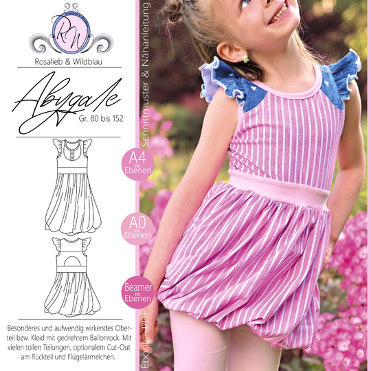 Abygale ist das Softeis unter den Shirts/Kleidern! Das Schnittmuster ist inspiriert vom Sommer, Softeis und meiner kleinen Maus, die besondere Kleider liebt. Das wirklich spezielle und außergewöhnliche Schnittmuster verfügt über zwei Längen - du kannst es als Oberteil nähen und z.B. zu einer Leggins tragen oder als langes Kleid. Der gedrehte Ballonrock des Schnittes erzeugt den „Softeislook“, welcher durch einen geteilten Außenrock ver- stärkt wird. Hier kannst du prima mit Musterstoffen spielen. Abygales Oberteil steht dem coolen Rock in nichts nach, denn hier gibt es verschiedene Teilungen für noch verspieltere Umsetzungen. Du hast die Wahl zwischen einer angesetzten Bolero-Teilung welche sich am Rückteil fortsetzt und einer rundlichen Teilung, die ein weiteres Mal durch eine Zierknopfleiste unterteilt werden kann. Möchtest du lieber alle Teilungen kombinieren?! Kein Problem - sie passen auch toll zueinander! Am Rückteil kannst du ein weiteres Highlight setzen - ein Cut-Out lädt zur weiteren Gestaltung ein. Mit etwas dehnbarer Spitze oder anderen Zierelementen kannst du hier noch einmal in die Vollen gehen. Abygale ist ein Sommerschnitt der keine Ärmel enthält. Die Armausschnitte werden mit einem Bündchen versehen und können zusätzlich durch Flügelärmel ergänzt werden. Der Halsausschnitt wird bei Abygale eingefasst statt mit einem Bündchen verarbeitet zu werden.