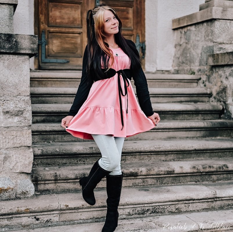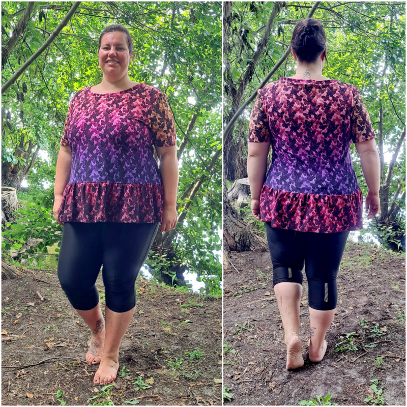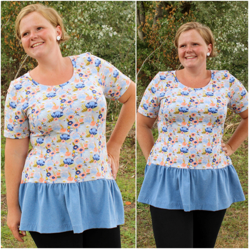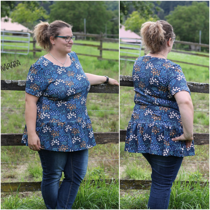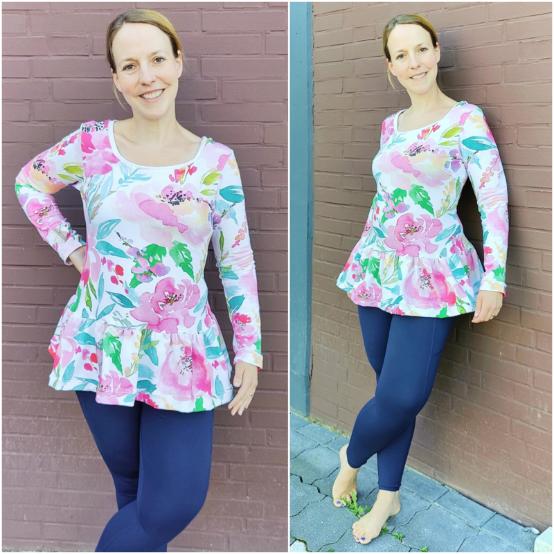 Aurora ist ein vielfältiges Schnittmuster mit zwei Grundvarianten: einer schmalen Variante mit Abnähern und bequemer Passform trotz figurbetonter Form und eine weite Variante, welche durch eine Raffung erzeugt wird. Beide Varianten werden mit einer Abschlussrüsche genäht. Die schmale Version ist etwas kürzer als die weite Version. Das Schnittmuster verfügt über eine Teilung auf der Brust. Diese kann in der schmalen Variante optional genäht werden und wird für die weite Version stets benötigt. Die Abschlussrüsche kannst du zusätzlich noch ein weiteres Mal unterteilen. Ergänzt werden diese Grundversionen durch verschiedene Ärmel für jede Jahreszeit. So gibt es einen normalen kurzen und langen Ärmel, einen kurzen und langen Puffärmel sowie die Möglichkeit Aurora ganz ohne Ärmel zu nähen. Die kurzen Puffärmel kannst du zusätzlich noch mit optionalen Ärmelrüschen ergänzen. Aurora wird mit einem Halsbündchen genäht und bietet durch die beiden Grundversionen eine Vielzahl an tollen Nähoptionen.
