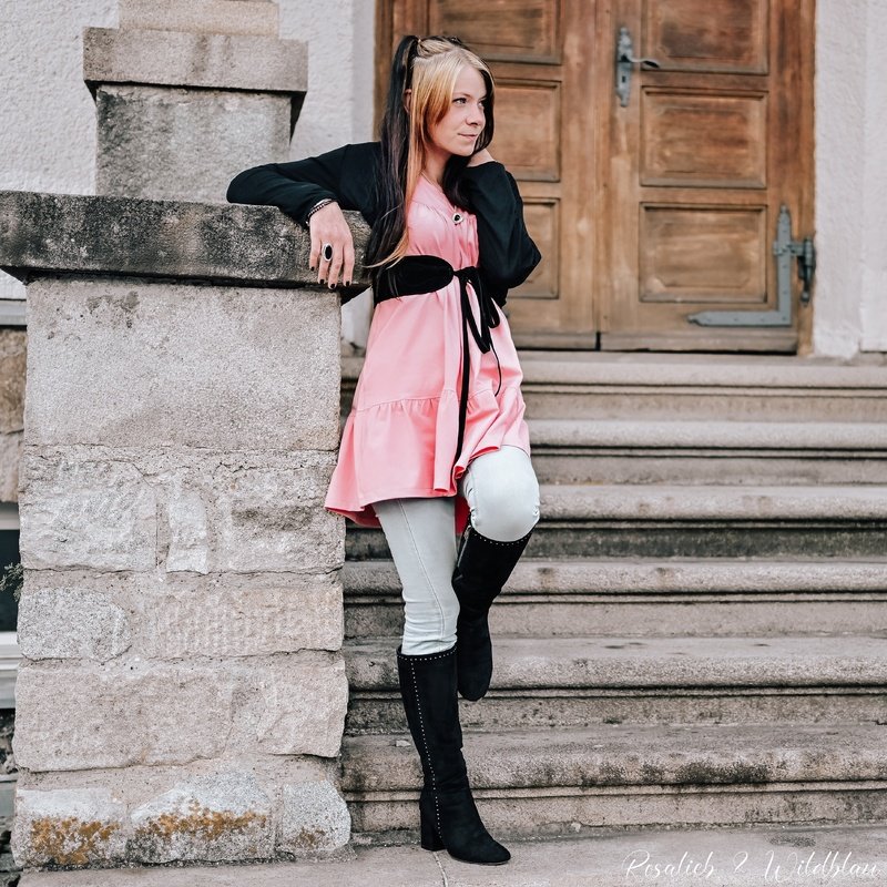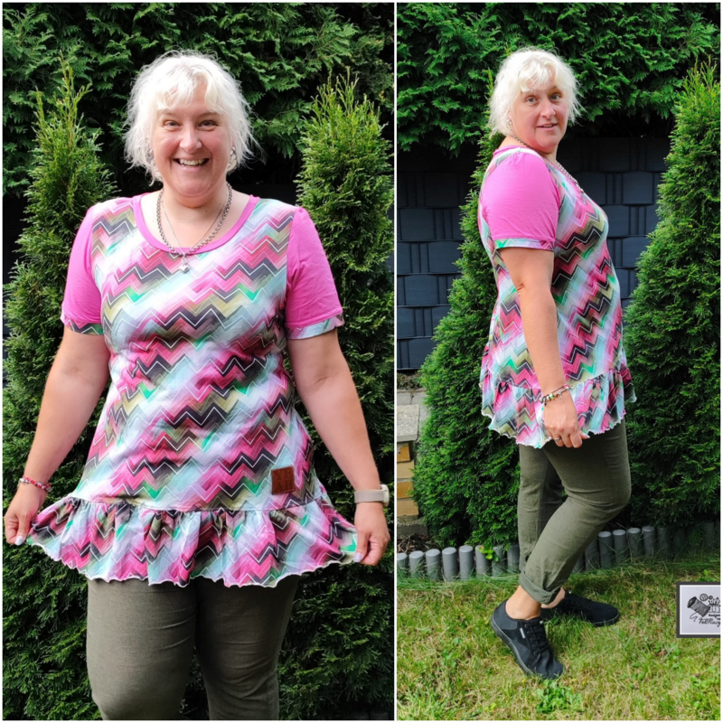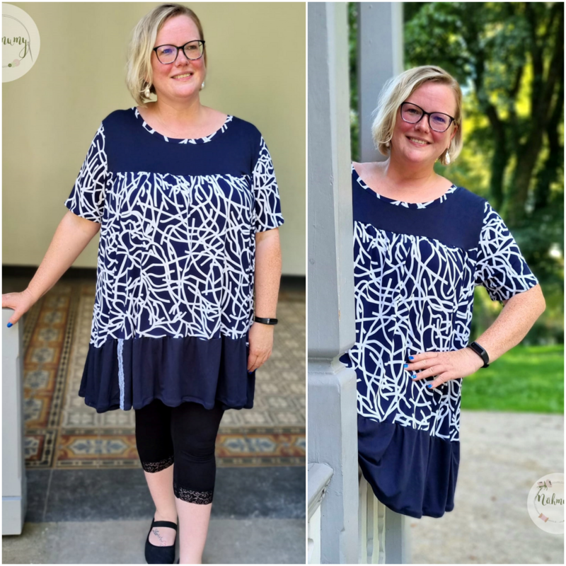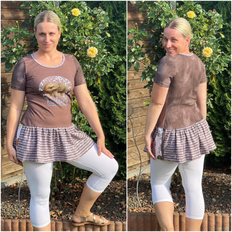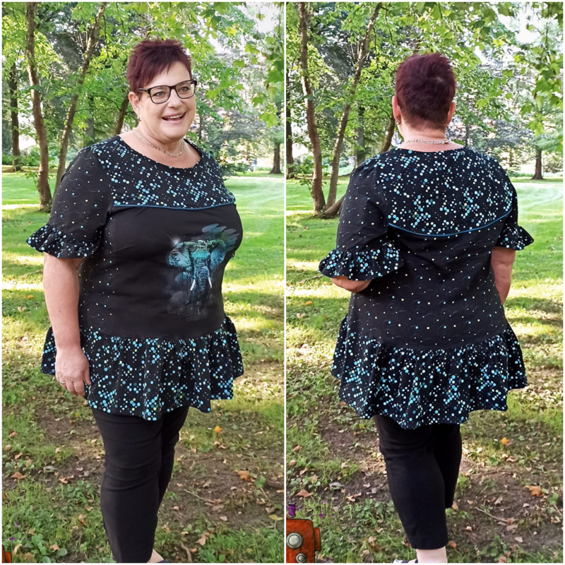 Aurora ist ein vielfältiges Schnittmuster mit zwei Grundvarianten: einer schmalen Variante mit Abnähern und bequemer Passform trotz figurbetonter Form und eine weite Variante, welche durch eine Raffung erzeugt wird. Beide Varianten werden mit einer Abschlussrüsche genäht. Die schmale Version ist etwas kürzer als die weite Version. Das Schnittmuster verfügt über eine Teilung auf der Brust. Diese kann in der schmalen Variante optional genäht werden und wird für die weite Version stets benötigt. Die Abschlussrüsche kannst du zusätzlich noch ein weiteres Mal unterteilen. Ergänzt werden diese Grundversionen durch verschiedene Ärmel für jede Jahreszeit. So gibt es einen normalen kurzen und langen Ärmel, einen kurzen und langen Puffärmel sowie die Möglichkeit Aurora ganz ohne Ärmel zu nähen. Die kurzen Puffärmel kannst du zusätzlich noch mit optionalen Ärmelrüschen ergänzen. Aurora wird mit einem Halsbündchen genäht und bietet durch die beiden Grundversionen eine Vielzahl an tollen Nähoptionen.