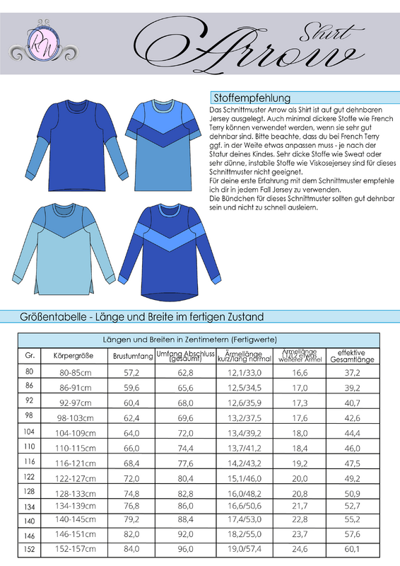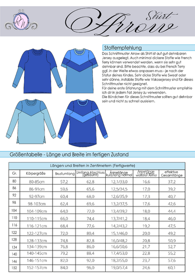 Das Schnittmuster ist in Echtgröße (du nähst hier nach echter Körpergröße) gradiert und enthält keine Nahtzugabe. Es umfasst die Größen 80 bis 152 und ist damit für eine Körpergröße zwischen 80 und 157cm geeignet. In den Dateien findest du die A4-Versionen zum Ausdrucken, eine A0-Datei sowie die Beamerdatei - alle Versionen inkl. Ebenen zum Ein- und Ausblenden der Größen. Arrow ist auf Jersey ausgelegt. Der Abschluss des Schnittmusters ist als Option auf einen Saumbelegausgelegt, welcher nicht als Schnittmusterteil sondern als Tutorial enthalten ist.