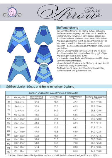 Das Schnittmuster ist in Echtgröße (du nähst hier nach echter Körpergröße) gradiert und enthält keine Nahtzugabe. Es umfasst die Größen 80 bis 152 und ist damit für eine Körpergröße zwischen 80 und 157cm geeignet. In den Dateien findest du die A4-Versionen zum Ausdrucken, eine A0-Datei sowie die Beamerdatei - alle Versionen inkl. Ebenen zum Ein- und Ausblenden der Größen. Arrow Hose ist auf Jersey und je nach Figurtyp auch auf French Terry ausgelegt.
