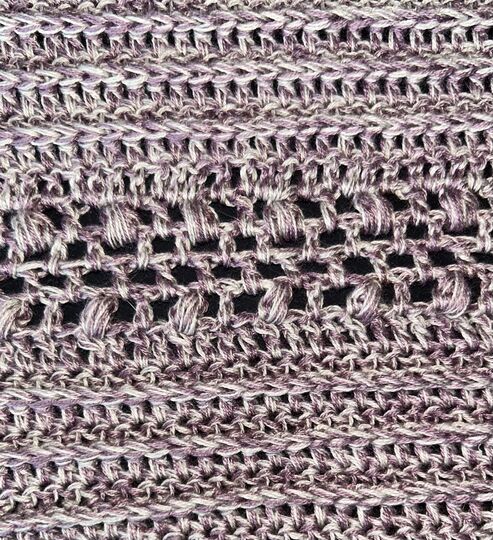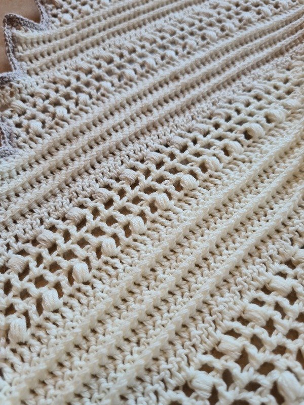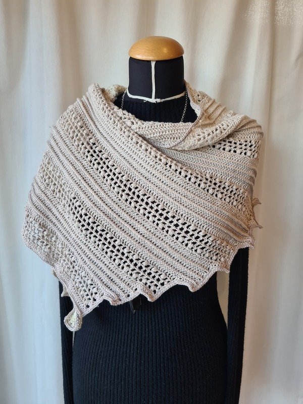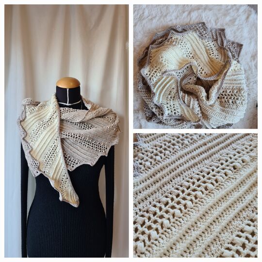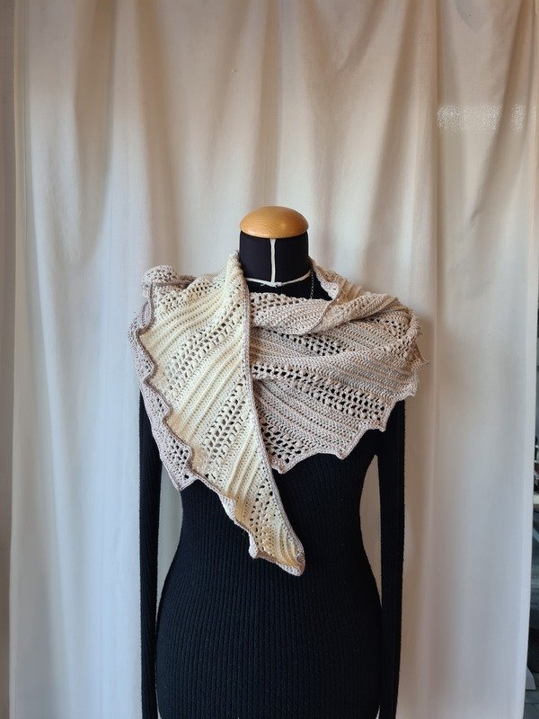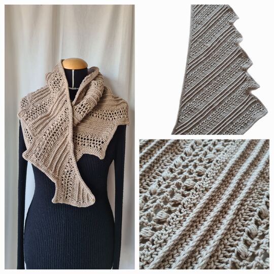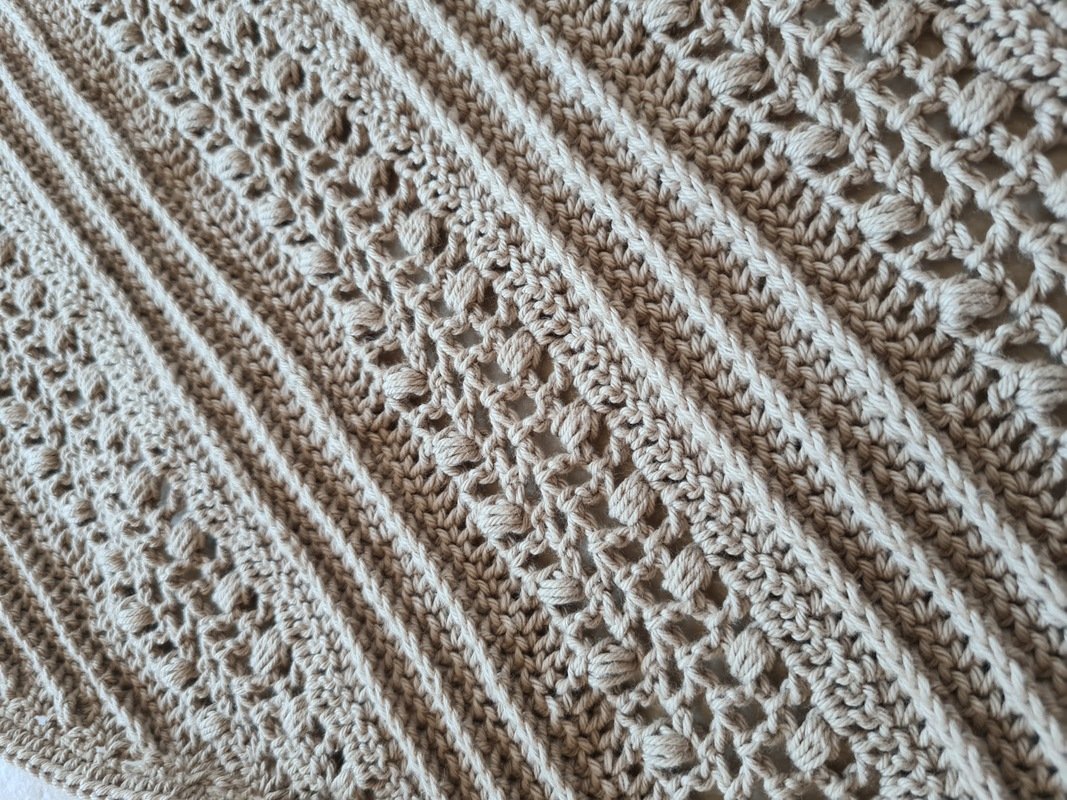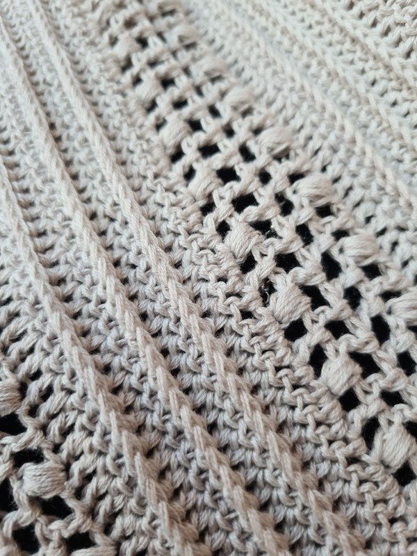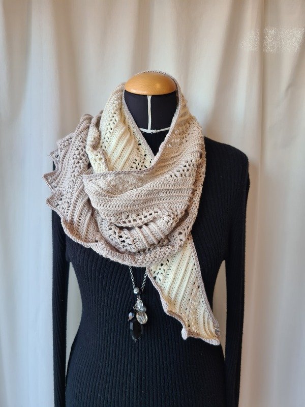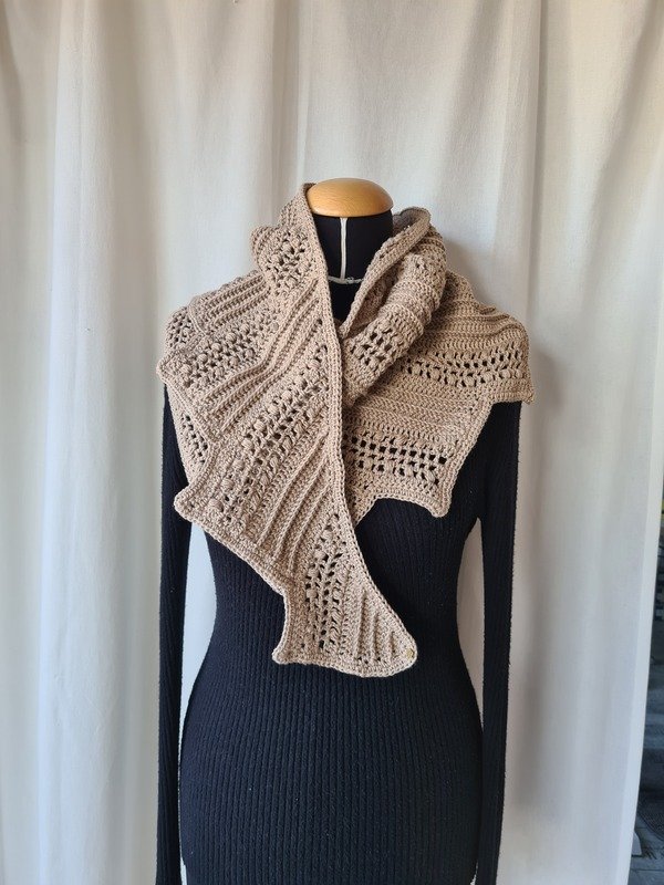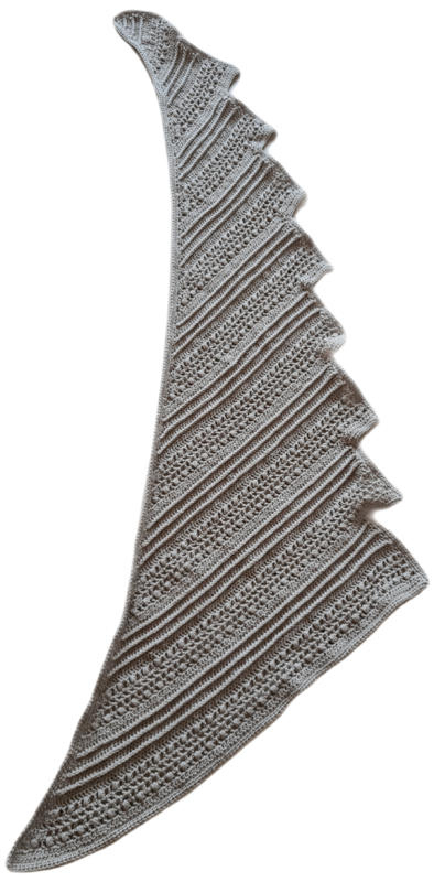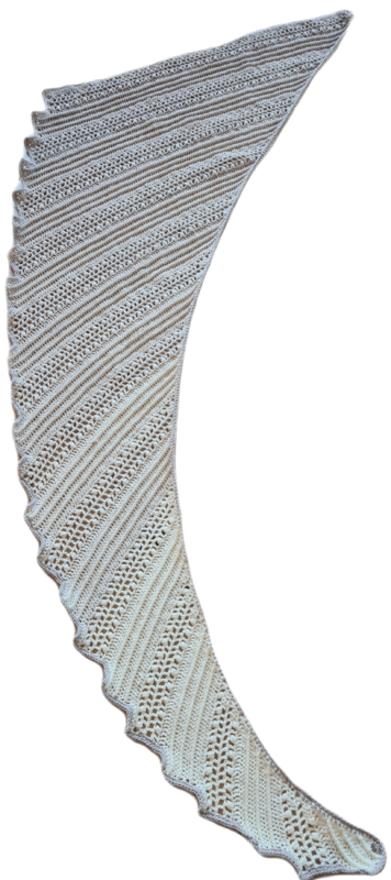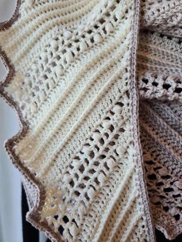 Mit Nadelstärke 3,5 habe ich den Rapport 9 mal wiederholen und der Schal ist 1,25m lang und 60cm breit geworden. Bei dieser Variante wird der Schal schnell sehr breit, daher reichen weniger Wiederholungen. Diesen Schal habe ich mit halben Stäbchen umhäkelt.