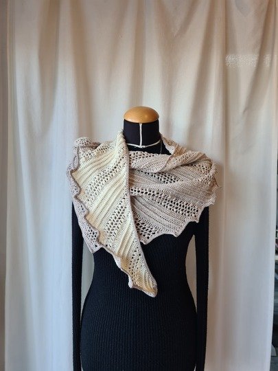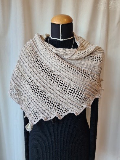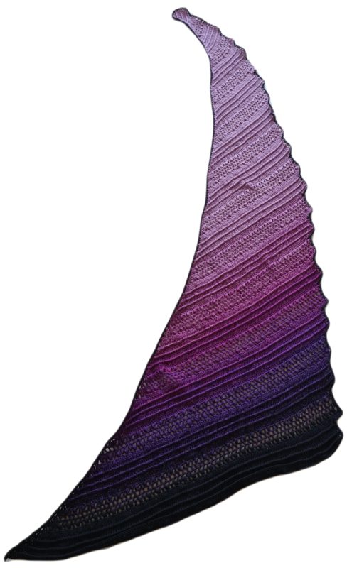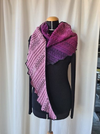 Mit Nadelstärke 4,0 habe ich den Rapport bei einem Schal 11,5 mal wiederholt und der Schal ist knapp 1,65m lang und an der breitesten Seite 70cm geworden,