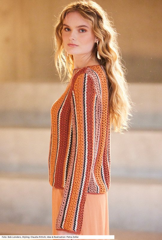Dieser Pullover bekommt seine Dynamik, durch vertikale Streifen in vier Farben. Alle Teile des Pullis werden quer gestrickt, wobei in Vorder- und Rückenteil die Längsstreifen mit Loch- und Jacquardmuster eine schmale Silhouette zaubern. Ärmel mit Armkugel ergeben einen perfekten Sitz an den Schultern. Der U-Boot-Ausschnitt und die Ärmelränder werden zum Schluss mit einem I-Cord-Rand verziert. Das Modell wird mit einem Garn aus Baumwolle und Viskose gearbeitet. Eine Anleitung steht in den Größen 36/38, 42/44 und 46/48 zur Verfügung.