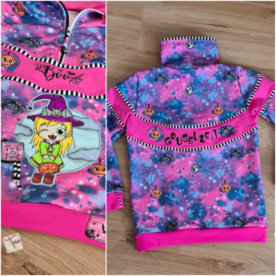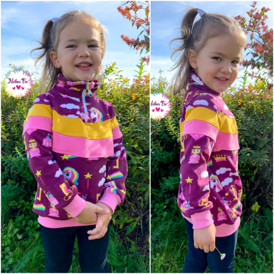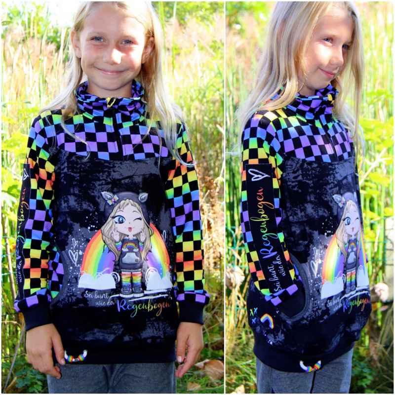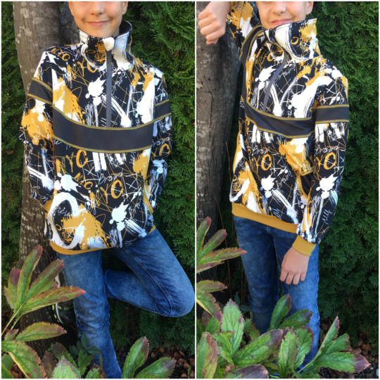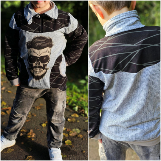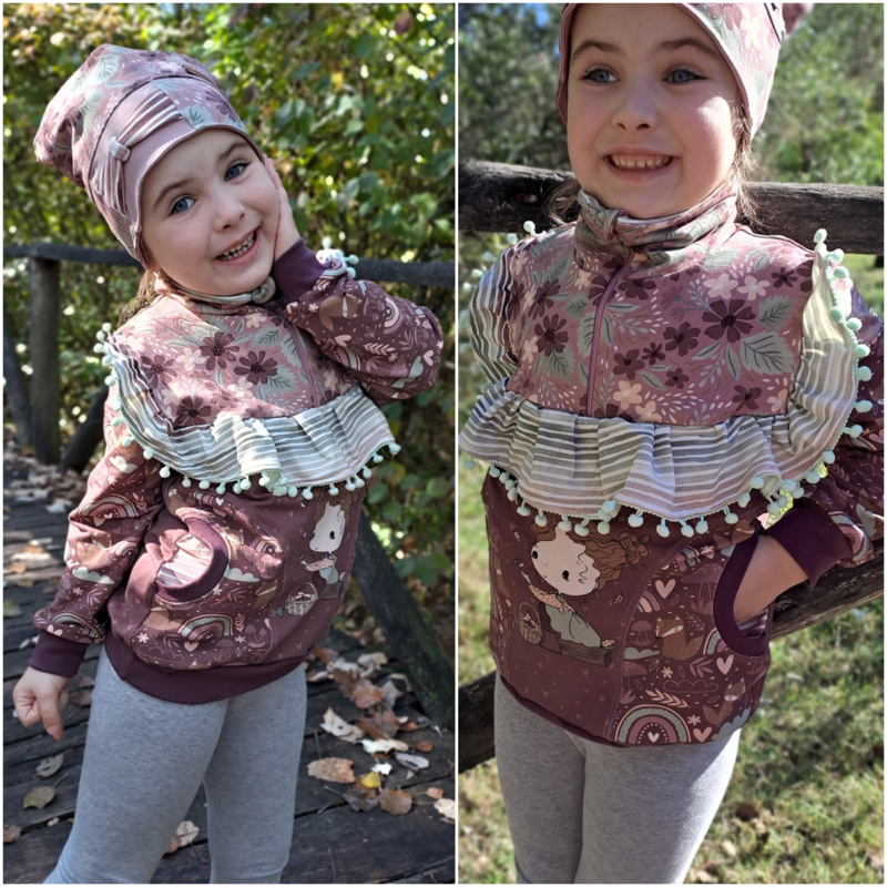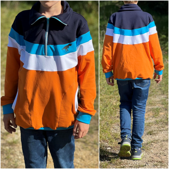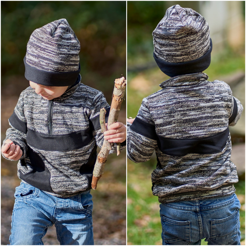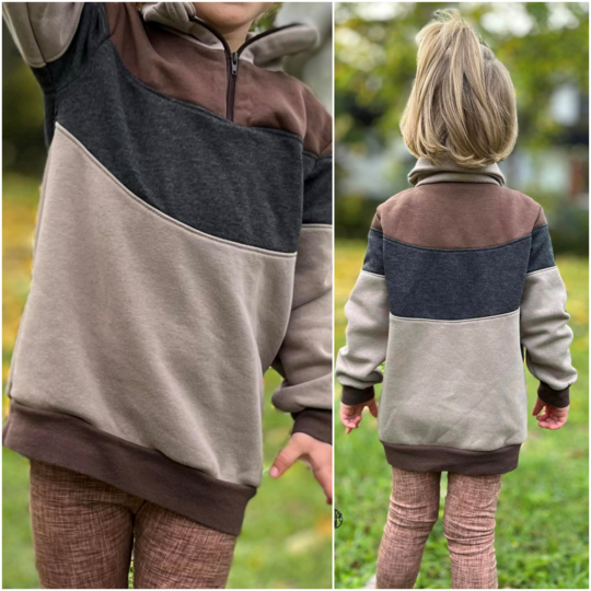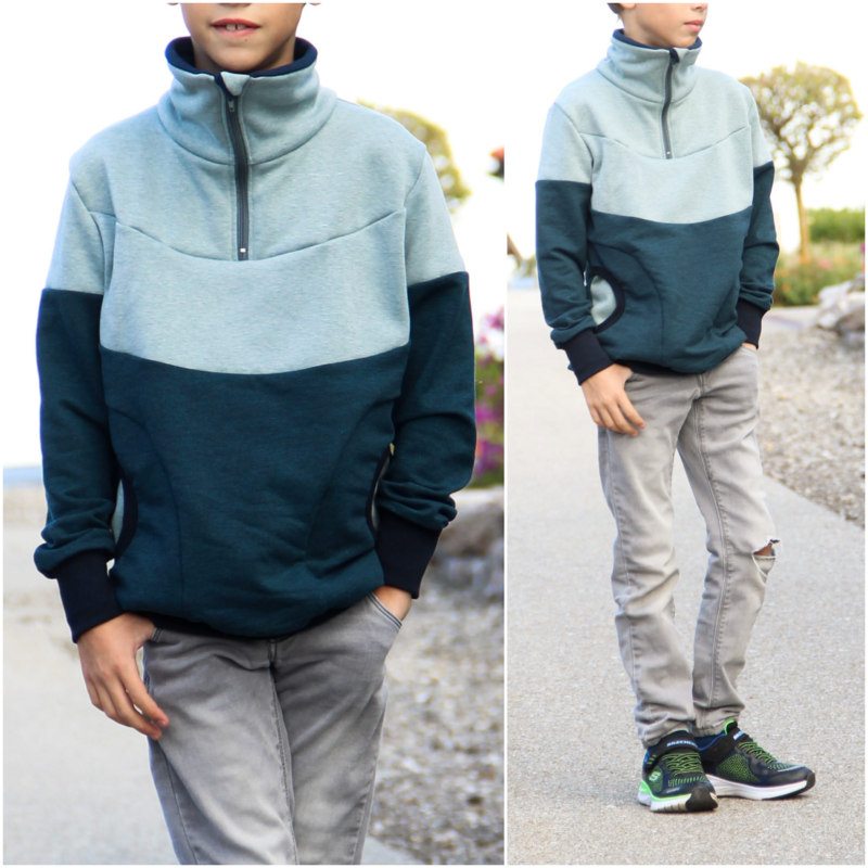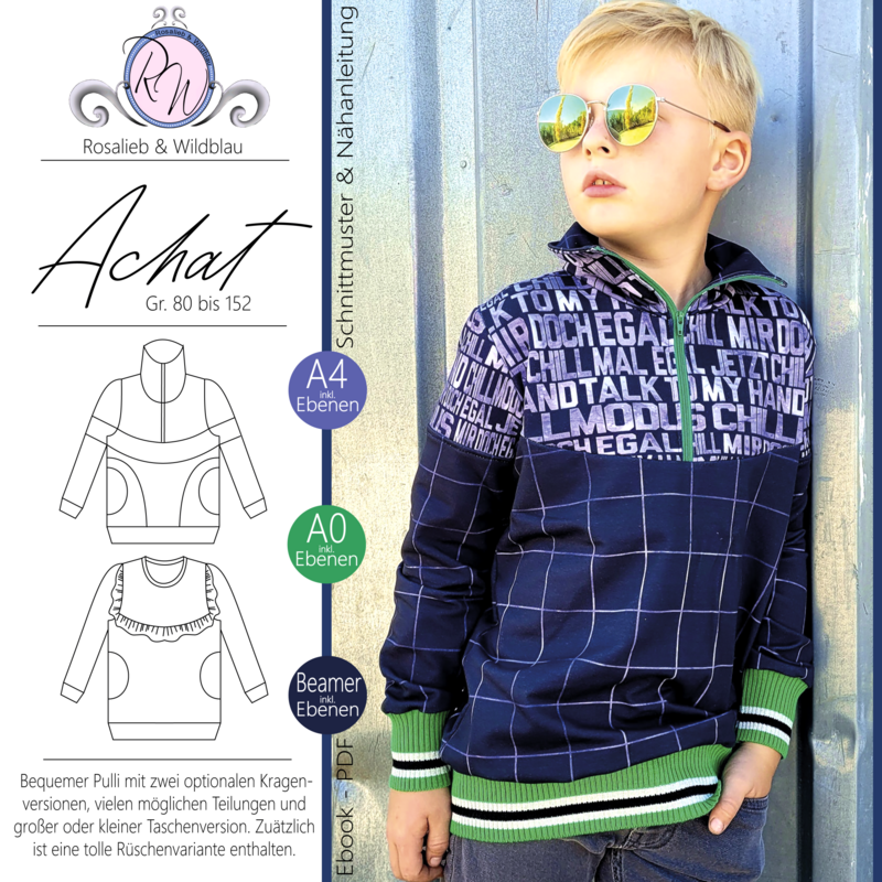 Achat ist ein bequemer Pulli für dickere Stoffe. Also perfekt für die kühleren Tage. Das Schnittmuster bietet dir viele Teilungsoptionen die von meinen Achatschnecken inspiriert sind :)! Diese kannst du wahlweise einzeln oder gemeinsam umsetzen. Ein weiteres wichtiges Detail am Schnittmuster ist der Kragen mit Reißverschluss. Diesen gibt es in einer kürzeren Variante, die geschlossen getragen werden kann und in einer längeren Variante, welche grundsätzlich offen und umgelegt getragen wird. Beide Kragenvarianten werden mit Reißverschluss genäht. Das Nähen des Reißverschlusses ist einfach und genau erklärt, sodass es dir auch gelingt, wenn du zuvor noch nicht mit einem Reißverschluss gearbeitet hast. Verwendet wird dazu ein einfacher, nicht teilbarer Sprial- Reißverschluss aus Kunststoff. Dieser ist günstig erhältlich und lässt sich toll einnähen. Ebenfalls benötigt wird zur Verstärkung bügelbares Vlies H250. Möchtest du deinen Achat lieber ohne Reißverschluss nähen, kannst du natürlich auch jederzeit auf ein Halsbündchen zurückgreifen. Neben den Teilungen und den Kragenoptionen kann Achat mit einer großen und einer kleinen Taschenversion genäht werden. Vervollständigt wird das Schnittmuster durch Bündchen an allen Abschlüssen, zwei optionale Grundlängen und optionale Rüschen für die oberen Teilungen.