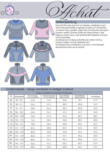 Das Schnittmuster ist in Echtgröße (du nähst hier nach echter Körpergröße) gradiert und enthält keine Naht- und Saumzugabe. Es umfasst die Größen 80 bis 152 und ist damit für eine Körpergröße zwischen 80 und 157cm geeignet. In den Dateien findest du die A4-Versionen zum Ausdrucken, eine Großdruckdatei sowie die Beamerdatei - alle Versionen inkl. Ebenen zum Ein- und Ausblenden der Größen. Achat ist auf dickere, noch dehnbare Stoffe ausgelegt. Verwendbar sind z.B. Sweat, French Terry, Fleece usw.