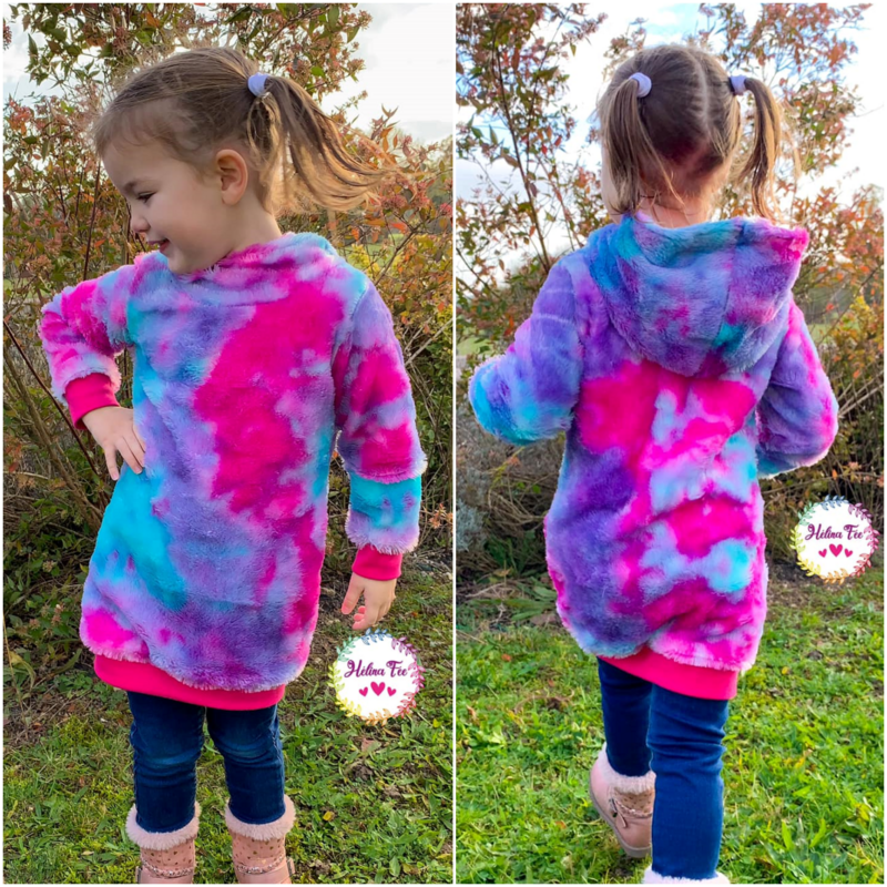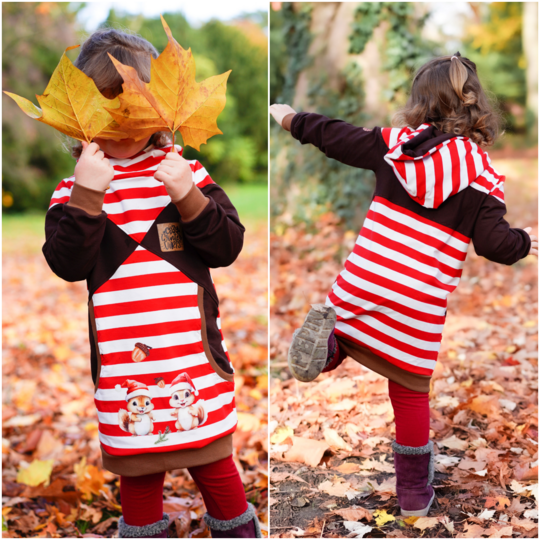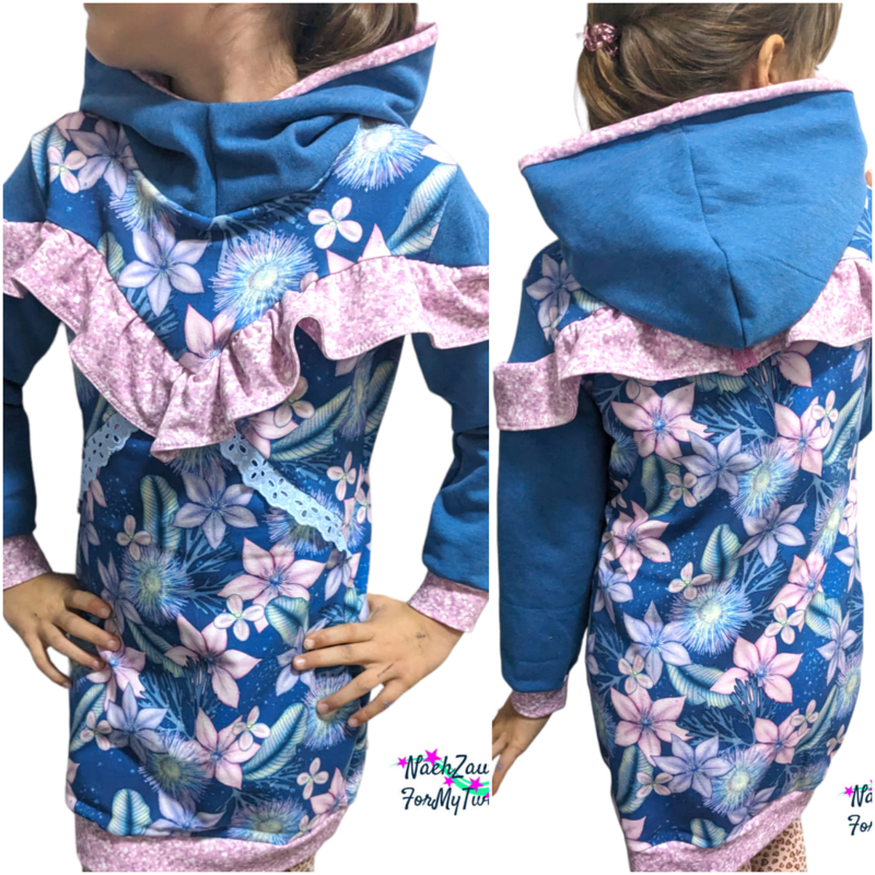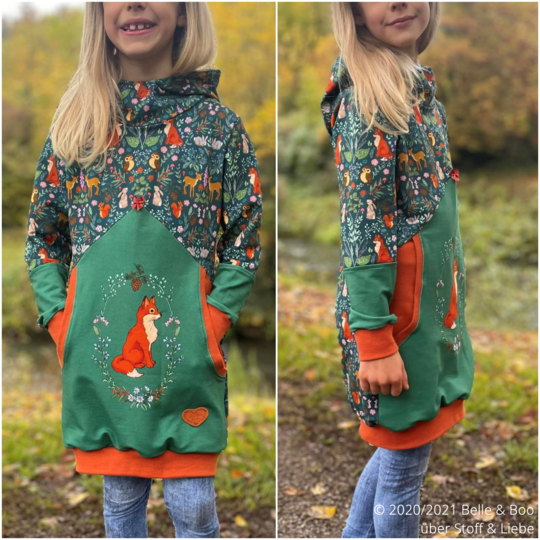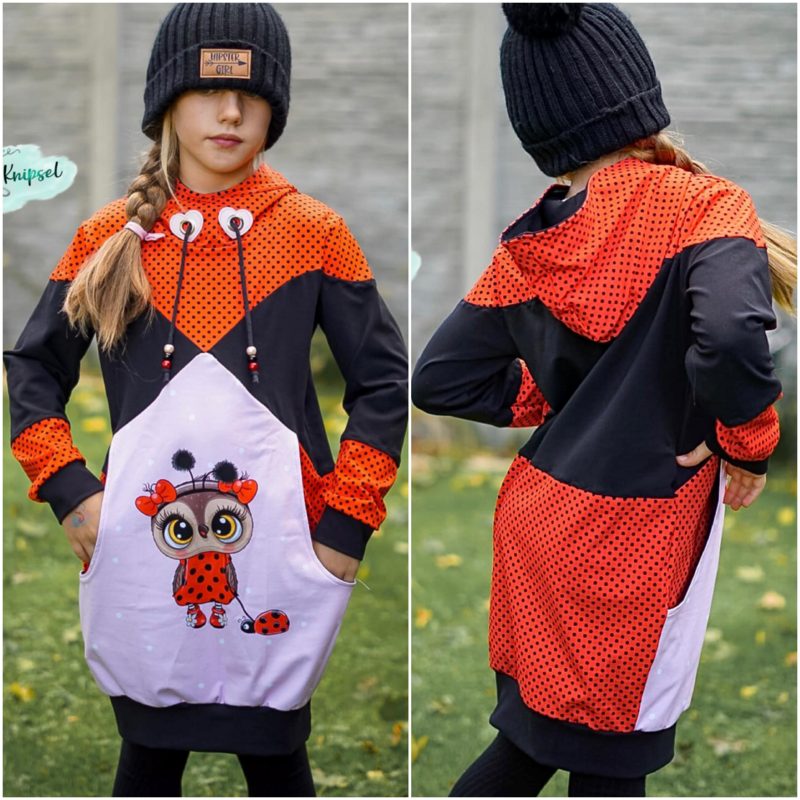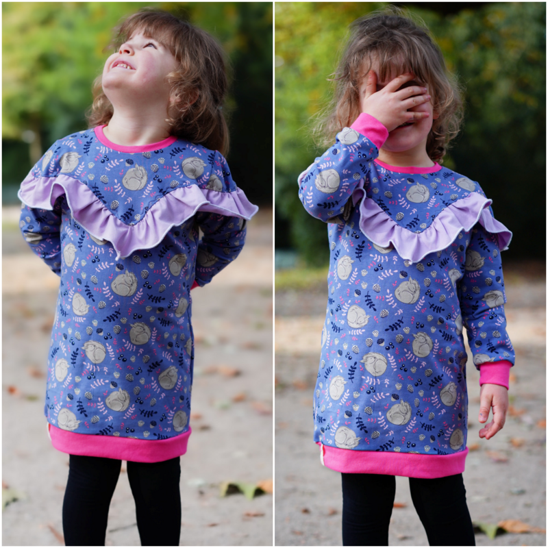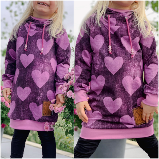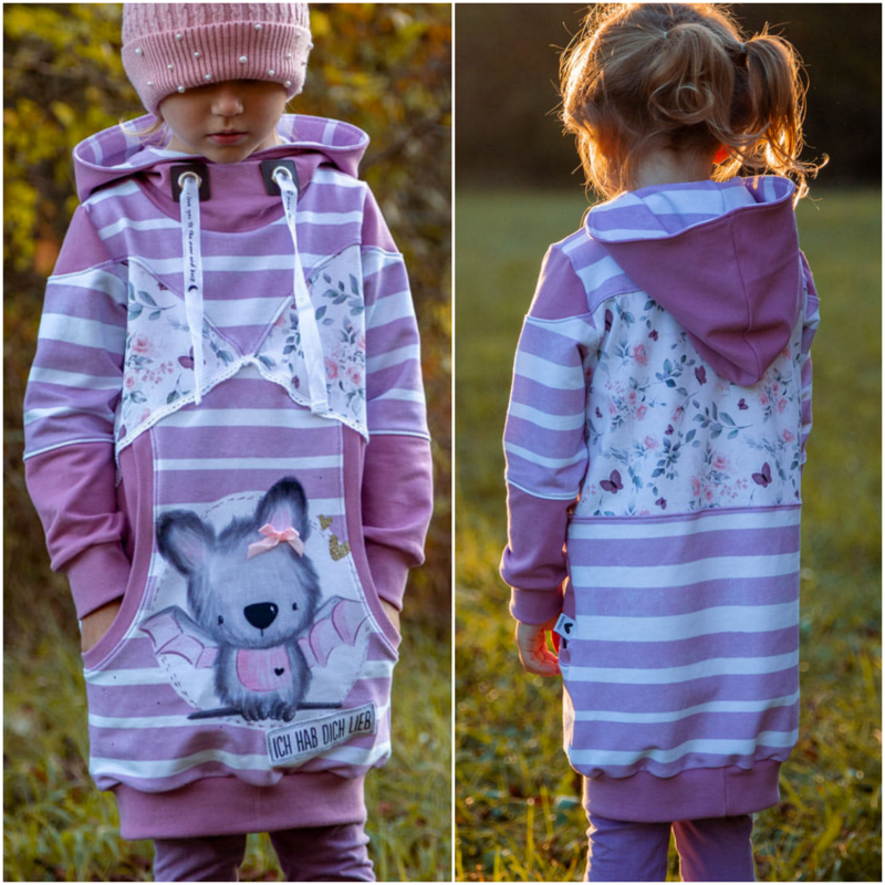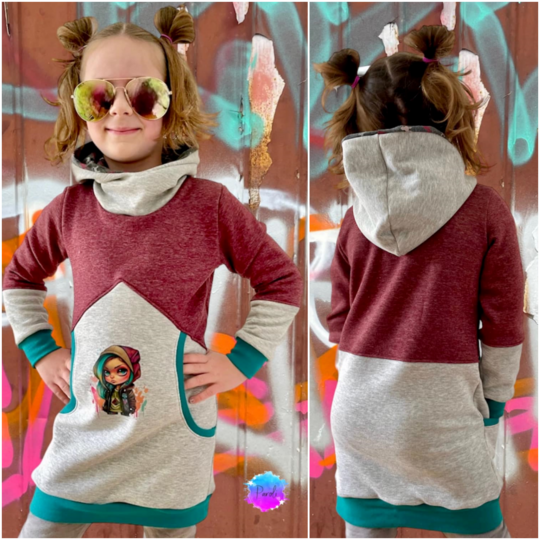 Agatha ist ein cooles, bequemes Kleid das für dickere, dehnbare Stoffe gedacht ist. Agatha verfügt über zwei unterschiedliche Grundformen. Es gibt eine gerade geschnittene Form und eine taillierte Form. Im Schnittmuster gibt es viele verschiedene Teilungen die gemeinsam oder getrennt umgesetzt werden können. Dabei fällt besonders die große, untere Teilung des Vorderteils auf. Diese Teilung kann mit verschiedenen Taschenoptionen genäht werden und ist ebenfalls weiter unterteilt. Für eine ganz besondere Agatha kann auch die enthaltene Rüsche verwendet werden. Diese Rüsche geht einmal um den Oberkörper und die Ärmel herum und lässt weitere, süße Varianten entstehen. Die Abschlüsse werden bei diesem Schnittmuster mit Bündchen versehen, sodass einer bequemen Passform und Bewegungsfreiheit nichts im Wege steht. Du kannst das Schnittmuster mit einer Astronautenkapuze ohne! Bündchen nähen oder mit einem Rundhalsausschnitt der um ein Halsbündchen ergänzt wird.