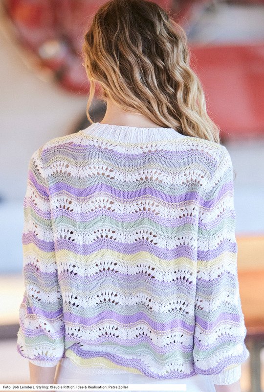 Dieser Pullover mit weiten Ärmeln lebt von einer perfekt aufeinander abgestimmten Farbkombination, die spannend, aber nie aufdringlich ist. Sowohl in Pastelltönen als auch in kräftigeren Farben kommt das Muster gut zur Geltung. Das Pfauenmuster sorgt für einen wellenförmiger Look. Der Bund am Saum, die Halsausschnittblende und die hohen Ärmelbündchen sind im 2/2-Rippenmuster gearbeitet. Durch Ärmel mit Armkugel sitzt der Pulli an den Schultern perfekt. Das Garn aus Baumwolle und Soja ist besonders weich. Eine Anleitung kann für die Größen 36/38, 44/46 und 52/54 downgeloadet werden.