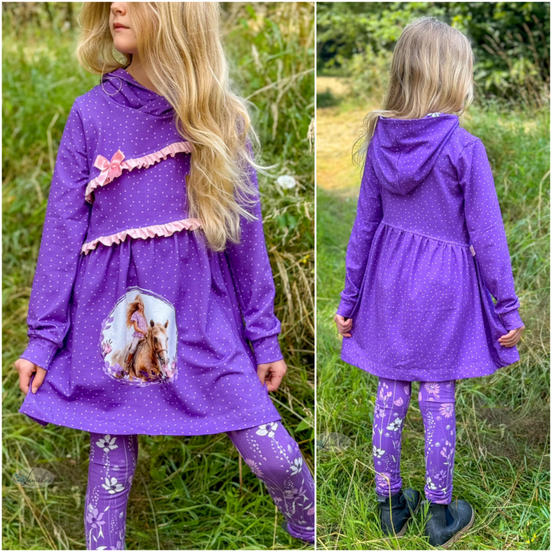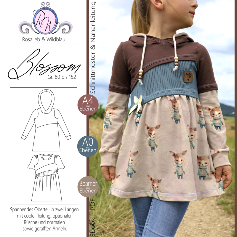 Das Schnittmuster ist in Echtgröße (du nähst hier nach echter Körpergröße) gradiert und enthält keine Naht- und Saumzugabe. Es umfasst die Größen 80 bis 152 und ist damit für eine Körpergröße zwischen 80 und 157cm geeignet. In den Dateien findest du die A4-Versionen zum Ausdrucken, eine Großdruckdatei sowie die Beamerdatei - alle Versionen inkl. Ebenen zum Ein- und Ausblenden der Größen. Blossom ist auf Jersey und Bündchenware ausgelegt.